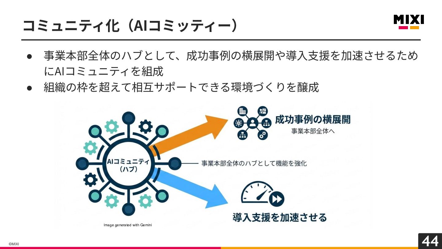 44 ©MIXI • 事業本部全体のハブとして、成功事例の横展開や導⼊⽀援を加速させるため にAIコミュニティを組成 • 組織の枠を超えて相互サポートできる環境づくりを醸成 コミュニティ化(AIコミッティー) Image generated