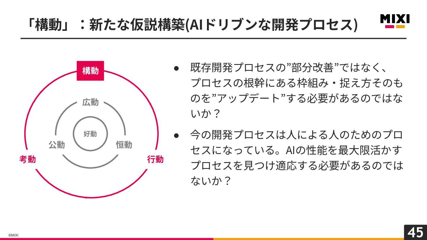 45 ©MIXI • 既存開発プロセスの”部分改善”ではなく、 プロセスの根幹にある枠組み‧捉え⽅そのも のを”アップデート”する必要があるのではな いか? • 今の開発プロセスは⼈による⼈のためのプロ セスになっている。AIの性能を最⼤限活かす