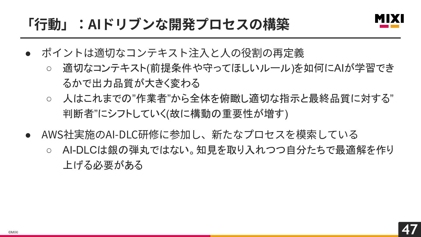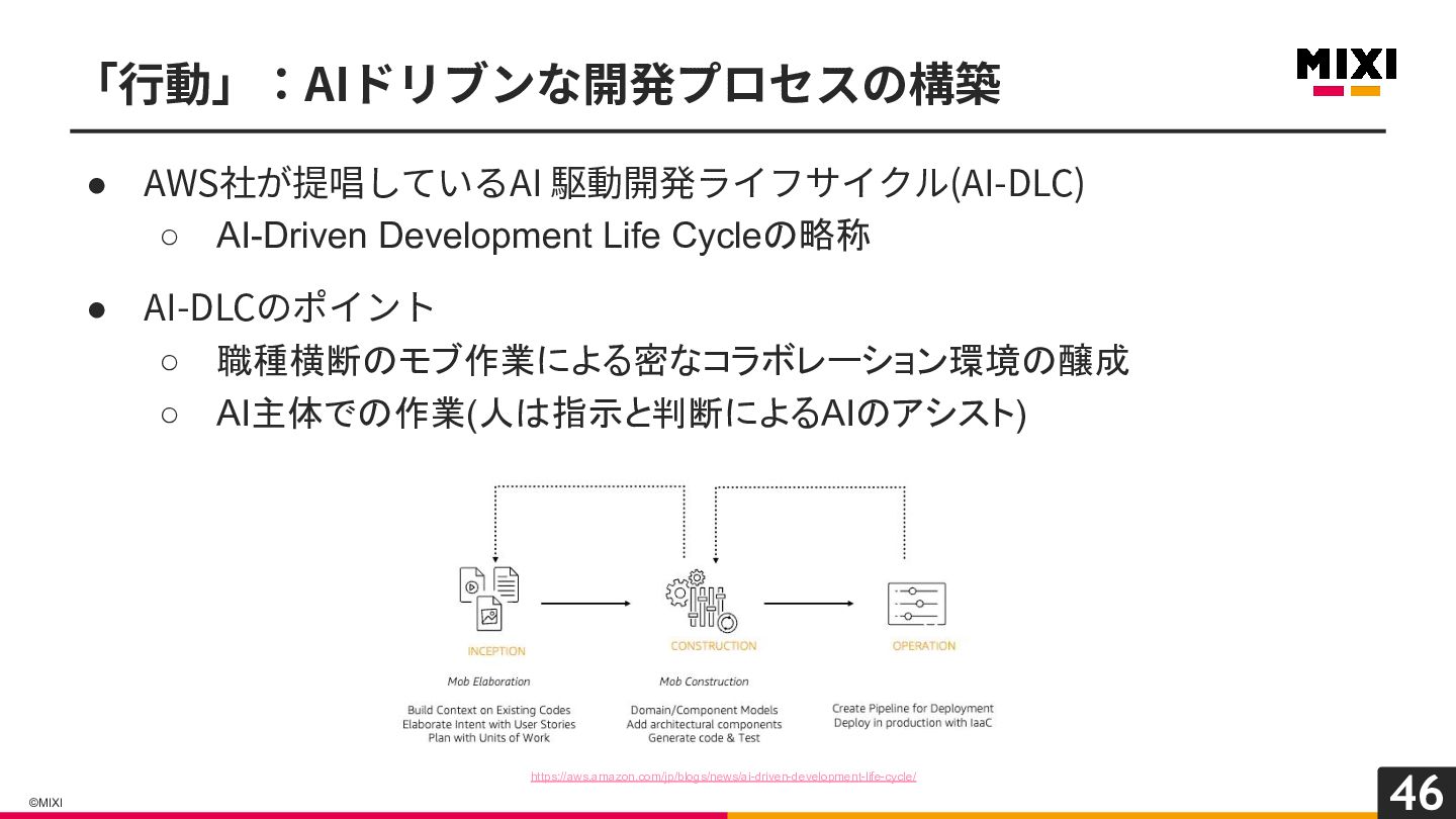 46 ©MIXI • AWS社が提唱しているAI 駆動開発ライフサイクル(AI-DLC) ◦ AI-Driven Development Life Cycleの略称
