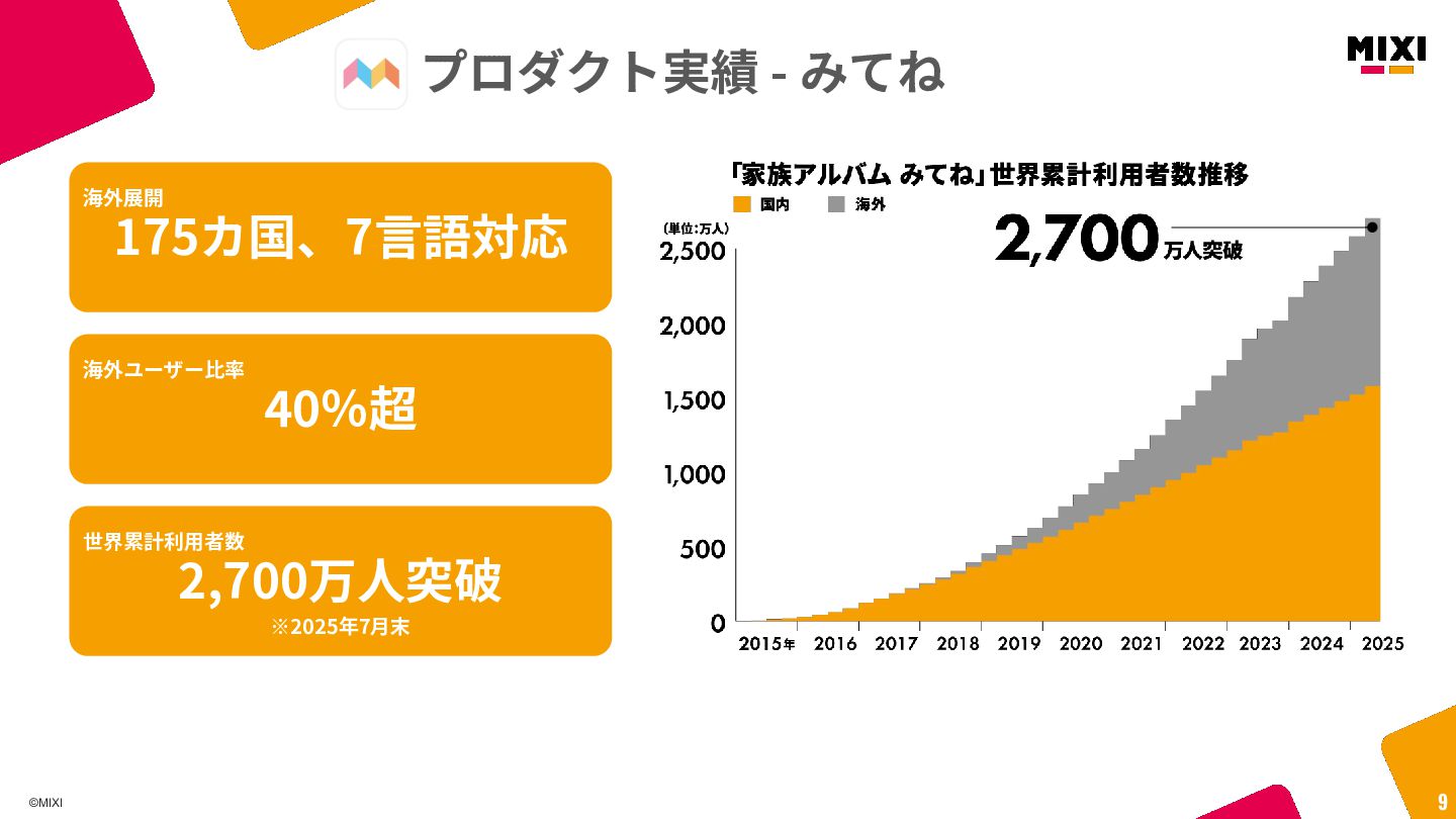©MIXI 9 プロダクト実績 - みてね 175カ国、7⾔語対応 海外展開 40%超 海外ユーザー⽐率 2,700万⼈突破