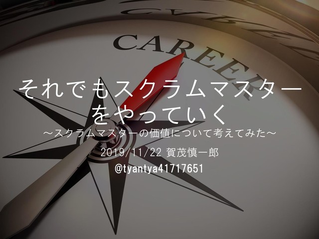 それでもスクラムマスター をやっていく ~スクラムマスターの価値について考えてみた~ 2019/11/22 賀茂慎一郎 @tyantya41717651
