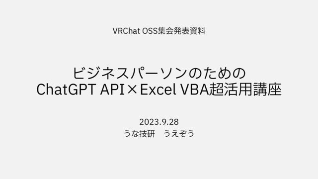2023年9月28日開催のVRChat OSS集会での発表資料。ChatGPT APIとExcel VBAを組み合わせて業務に活かすお話です。 以下、私の著書の背景にあるビジネス的なお話なども含んでいます。興味を持ってくださったらぜひ! https://www.amazon.co.jp/dp/429501768X