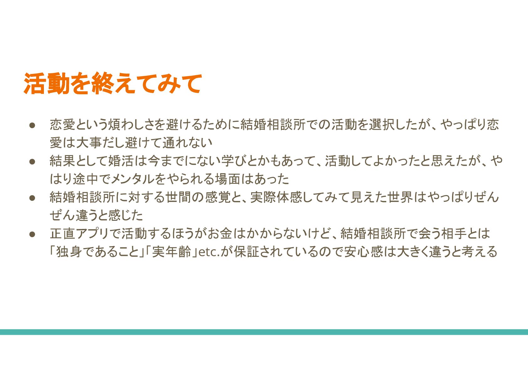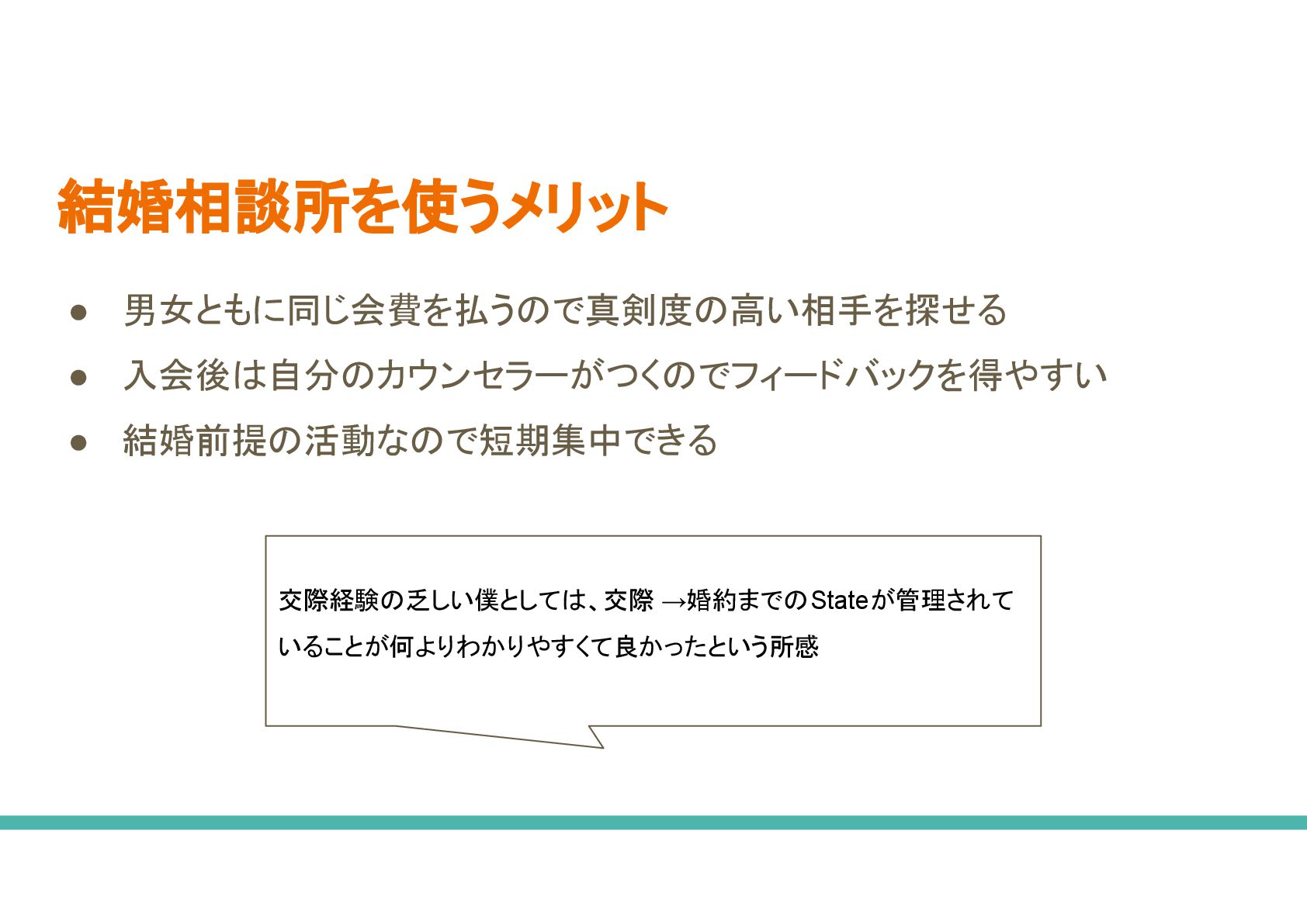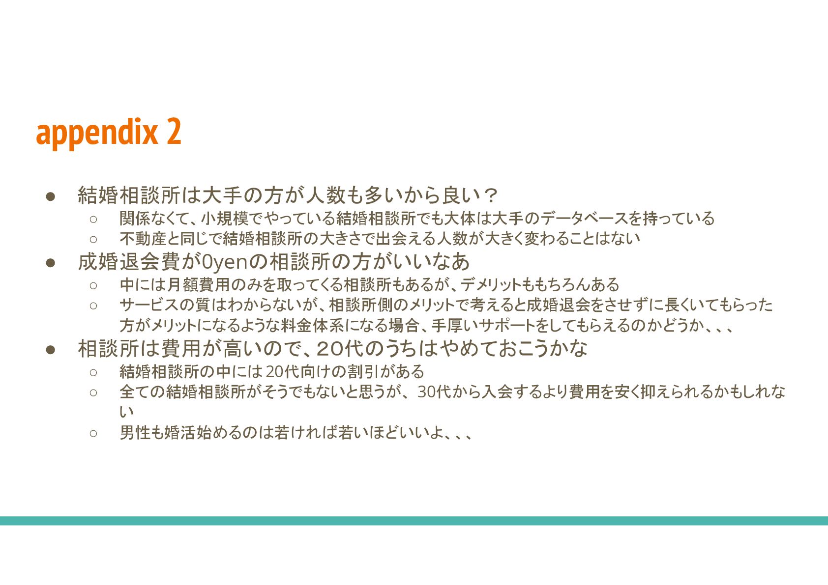 ◦ 不動産と同じで結婚相談所 大きさで出会える人数が大きく変わること ない • 成婚退会費が0yen 相談所 方がいいなあ ◦ 中に 月額費用 みを取ってくる相談所もあるが、デメリットももちろんある ◦ サービス 質 わからないが、相談所側 メリットで考えると成婚退会をさせずに長くいてもらった 方がメリットになるような料金体系になる場合、手厚いサポートをしてもらえる かどうか、、、 • 相談所 費用が高い で、20代 うち やめておこうかな ◦ 結婚相談所 中に 20代向け 割引がある ◦ 全て 結婚相談所がそうでもないと思うが、 30代から入会するより費用を安く抑えられるかもしれな い ◦ 男性も婚活始める 若けれ 若いほどいいよ、、、