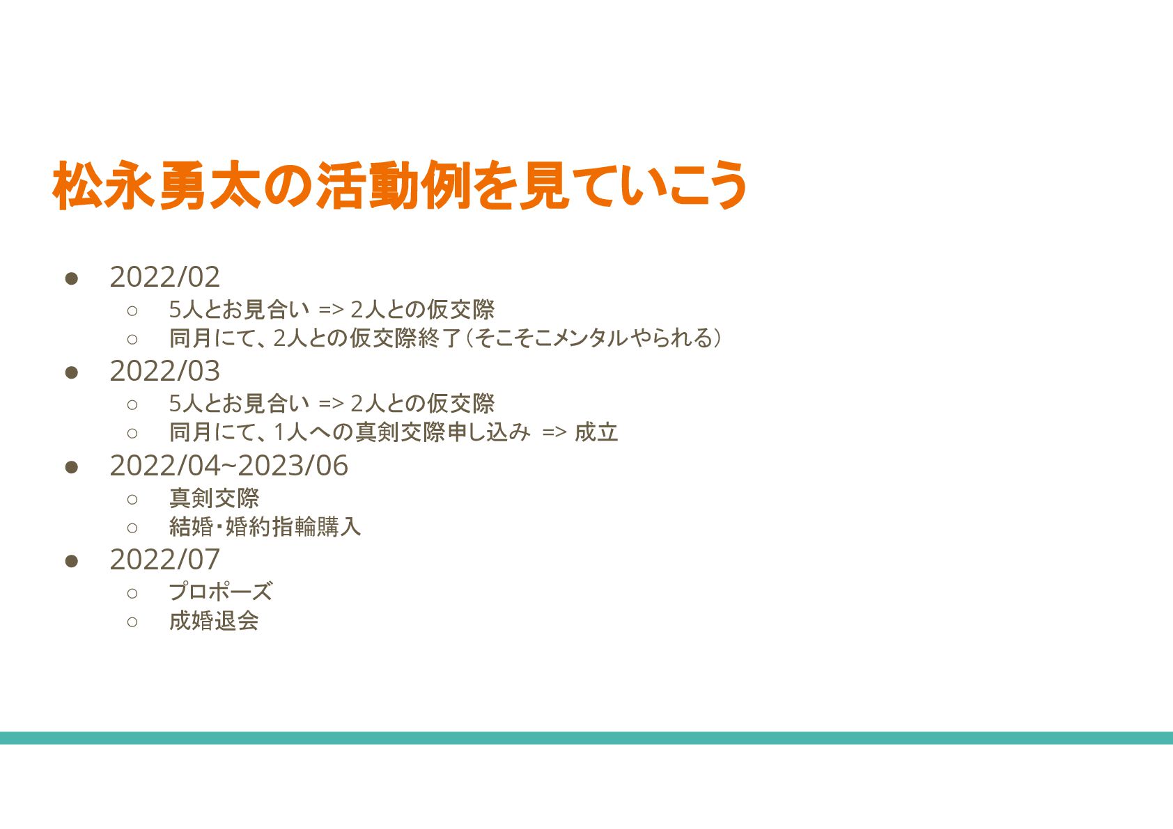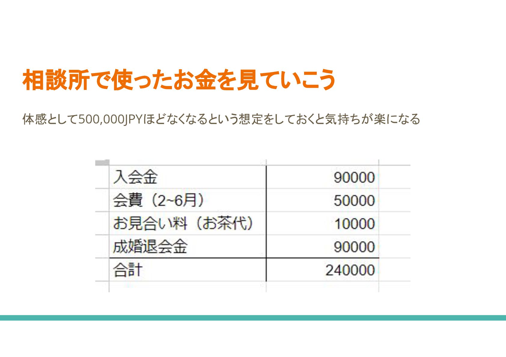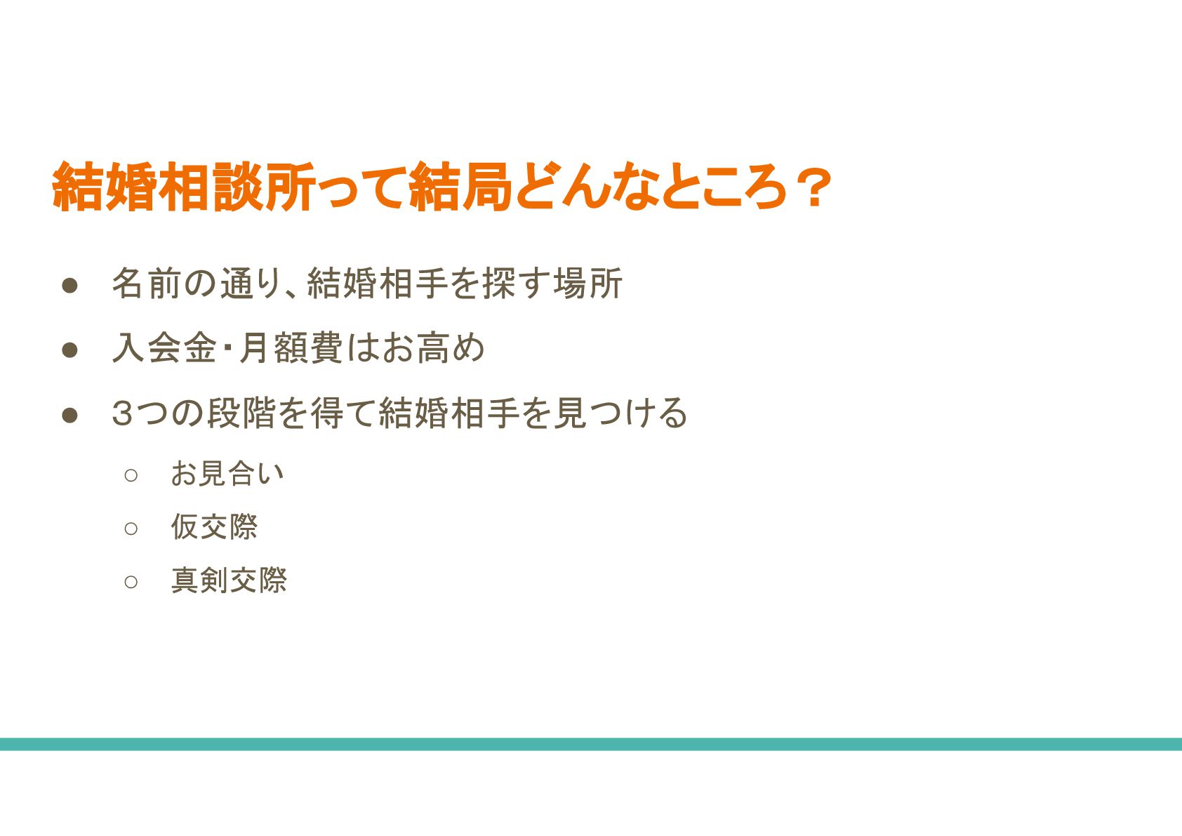 ◦ 不動産と同じで結婚相談所 大きさで出会える人数が大きく変わること ない • 成婚退会費が0yen 相談所 方がいいなあ ◦ 中に 月額費用 みを取ってくる相談所もあるが、デメリットももちろんある ◦ サービス 質 わからないが、相談所側 メリットで考えると成婚退会をさせずに長くいてもらった 方がメリットになるような料金体系になる場合、手厚いサポートをしてもらえる かどうか、、、 • 相談所 費用が高い で、20代 うち やめておこうかな ◦ 結婚相談所 中に 20代向け 割引がある ◦ 全て 結婚相談所がそうでもないと思うが、 30代から入会するより費用を安く抑えられるかもしれな い ◦ 男性も婚活始める 若けれ 若いほどいいよ、、、