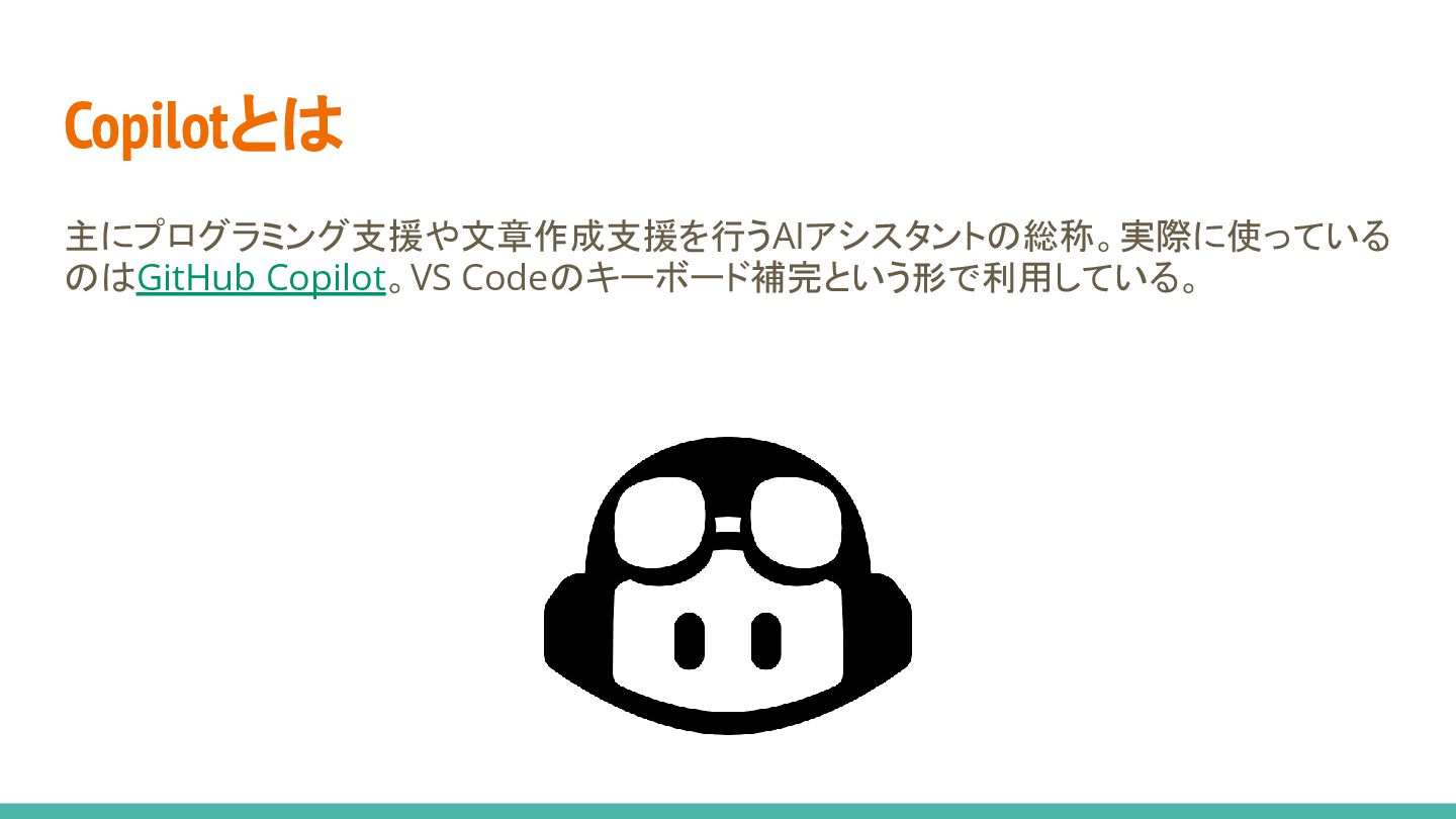 Copilotとは 主にプログラミング支援や文章作成支援を行うAIアシスタントの総称。実際に使っている のはGitHub Copilot。VS Codeのキーボード補完という形で利用している。