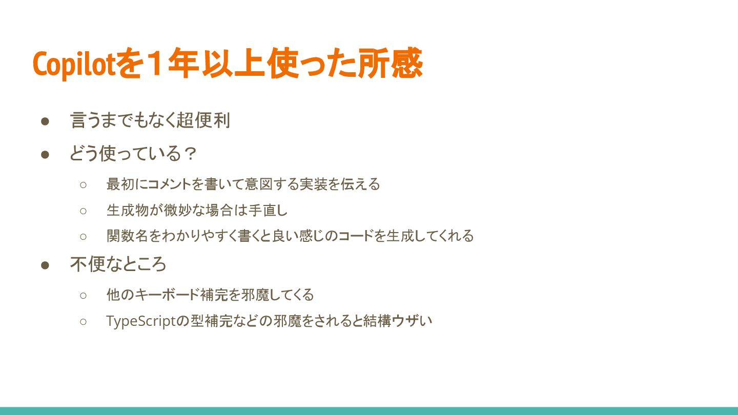 Copilotを1年以上使った所感 • 言うまでもなく超便利 • どう使っている? ◦ 最初にコメントを書いて意図する実装を伝える ◦ 生成物が微妙な場合は手直し ◦