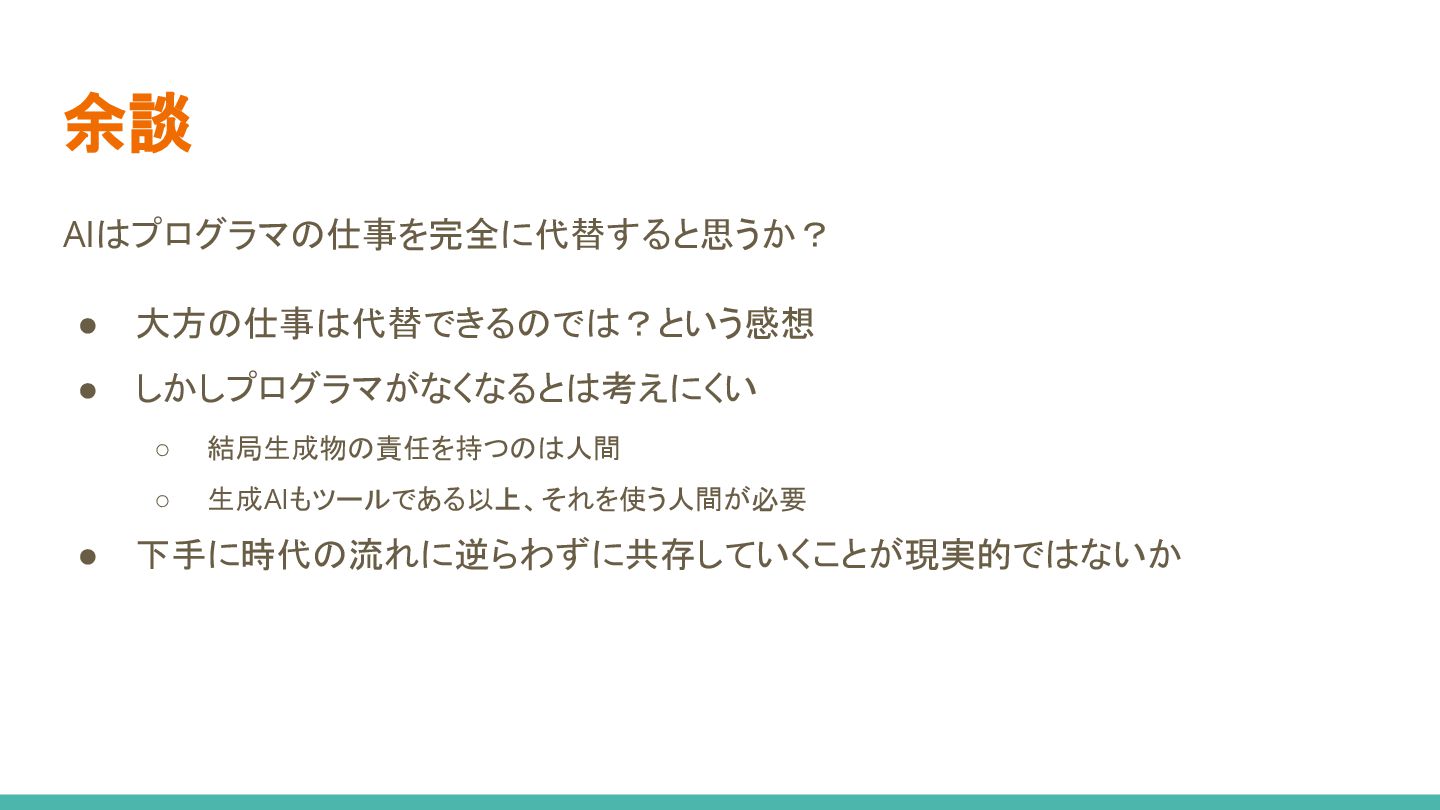 余談 AIはプログラマの仕事を完全に代替すると思うか? • 大方の仕事は代替できるのでは?という感想 • しかしプログラマがなくなるとは考えにくい ◦ 結局生成物の責任を持つのは人間 ◦ 生成AIもツールである以上、それを使う人間が必要