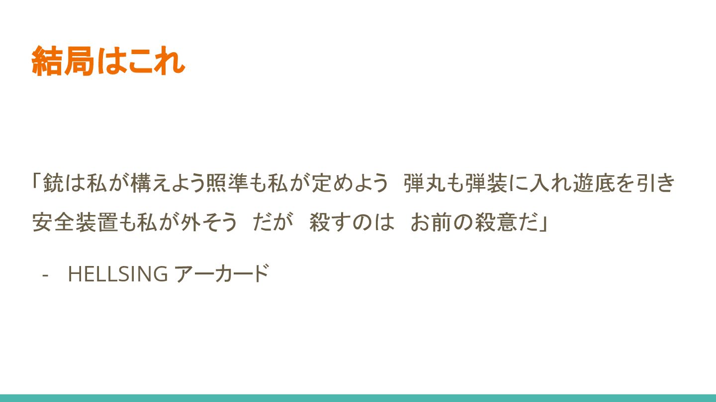 結局はこれ 「銃は私が構えよう照準も私が定めよう 弾丸も弾装に入れ遊底を引き 安全装置も私が外そう だが 殺すのは お前の殺意だ」 - HELLSING アーカード