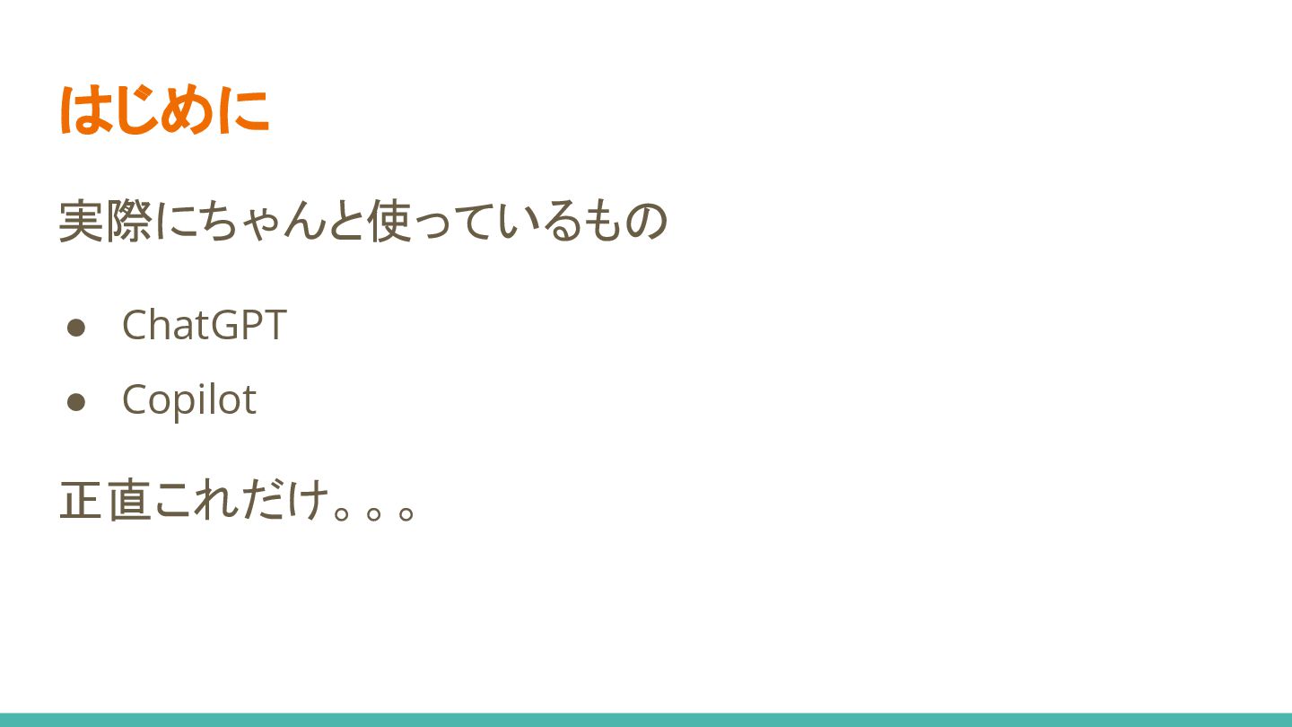はじめに 実際にちゃんと使っているもの • ChatGPT • Copilot 正直これだけ。。。