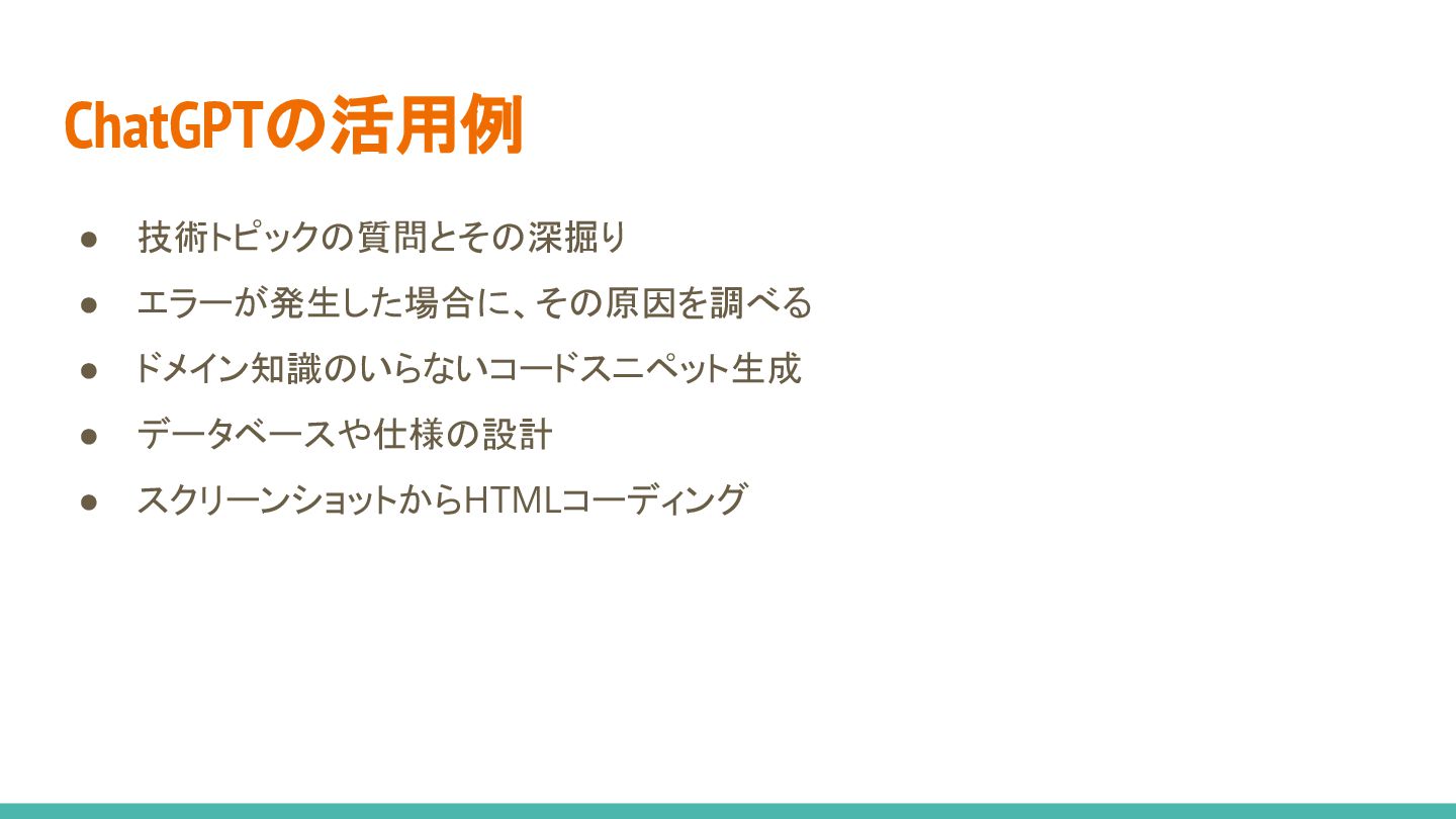 ChatGPTの活用例 • 技術トピックの質問とその深掘り • エラーが発生した場合に、その原因を調べる • ドメイン知識のいらないコードスニペット生成 • データベースや仕様の設計 •