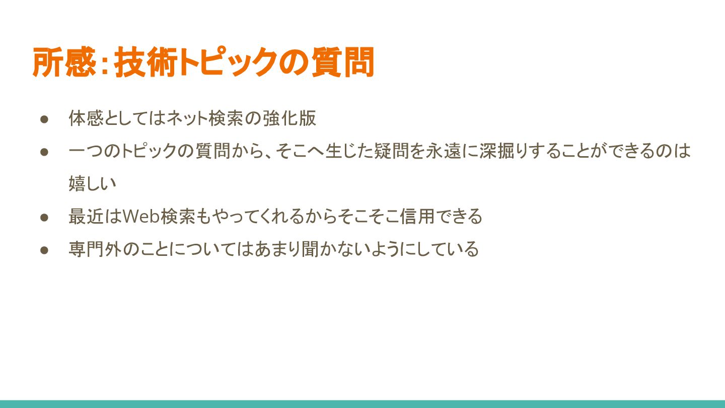 所感:技術トピックの質問 • 体感としてはネット検索の強化版 • 一つのトピックの質問から、そこへ生じた疑問を永遠に深掘りすることができるのは 嬉しい • 最近はWeb検索もやってくれるからそこそこ信用できる • 専門外のことについてはあまり聞かないようにしている