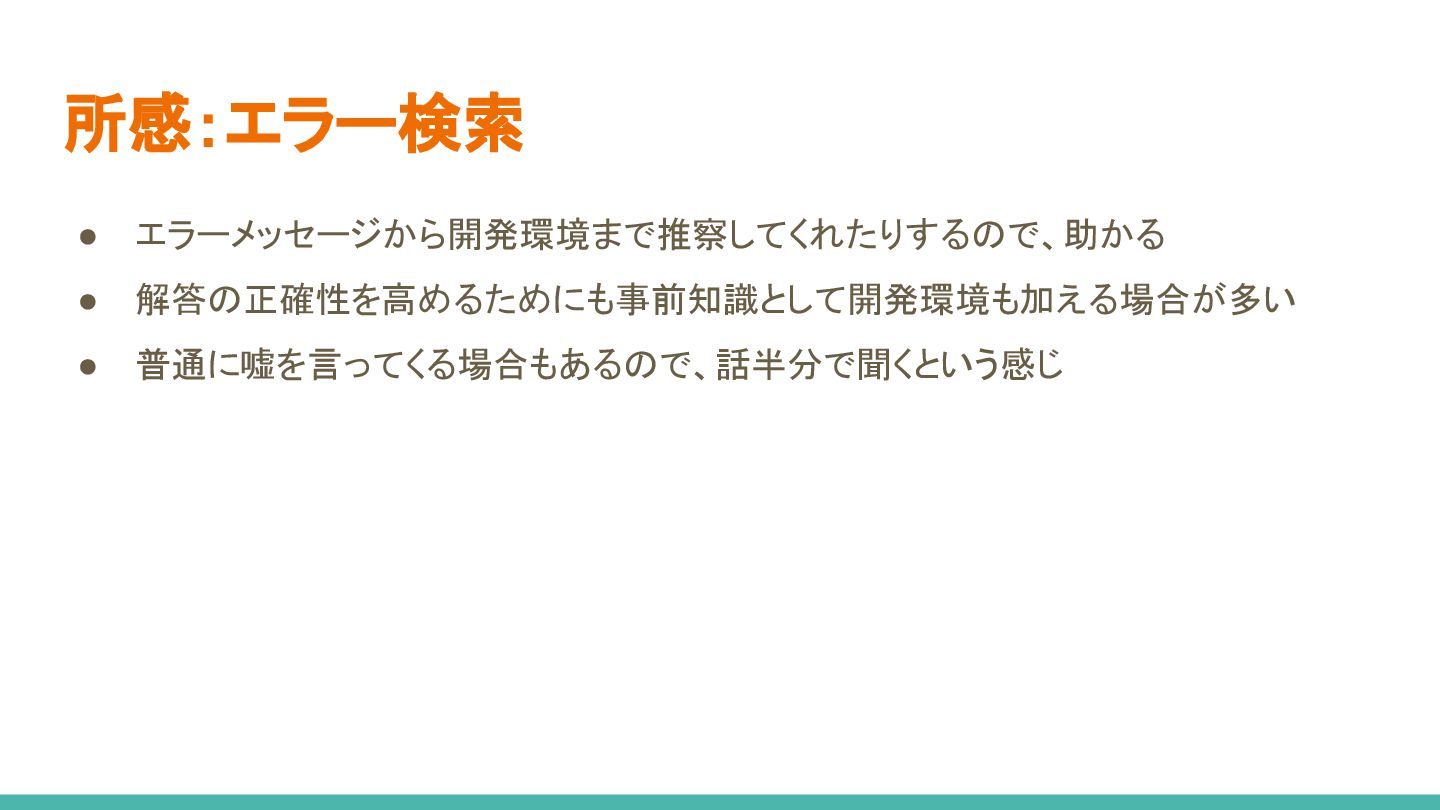 所感:エラー検索 • エラーメッセージから開発環境まで推察してくれたりするので、助かる • 解答の正確性を高めるためにも事前知識として開発環境も加える場合が多い • 普通に嘘を言ってくる場合もあるので、話半分で聞くという感じ