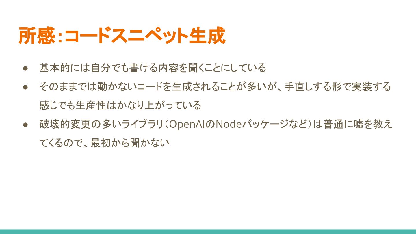 所感:コードスニペット生成 • 基本的には自分でも書ける内容を聞くことにしている • そのままでは動かないコードを生成されることが多いが、手直しする形で実装する 感じでも生産性はかなり上がっている • 破壊的変更の多いライブラリ(OpenAIのNodeパッケージなど)は普通に嘘を教え てくるので、最初から聞かない