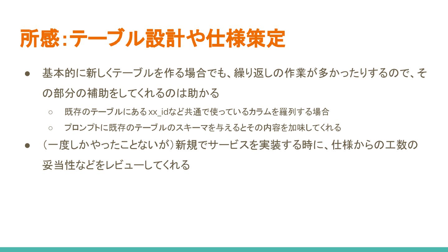 所感:テーブル設計や仕様策定 • 基本的に新しくテーブルを作る場合でも、繰り返しの作業が多かったりするので、そ の部分の補助をしてくれるのは助かる ◦ 既存のテーブルにある xx_idなど共通で使っているカラムを羅列する場合 ◦ プロンプトに既存のテーブルのスキーマを与えるとその内容を加味してくれる •