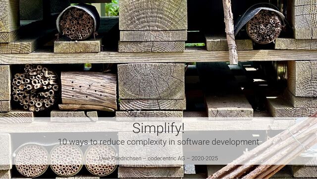 The main part of the slide deck presents and discusses 10 basic ideas how to reduce complexity in software development – or to be more precise in the systems created during software development. The discussion of the 10 ideas does not provide fine-grained instructions as this would be way beyond the scope of this talk. Instead, it provides a different perspective on many widespread and "proven" practices that drive complexity and offers alternative approaches to address these topics.