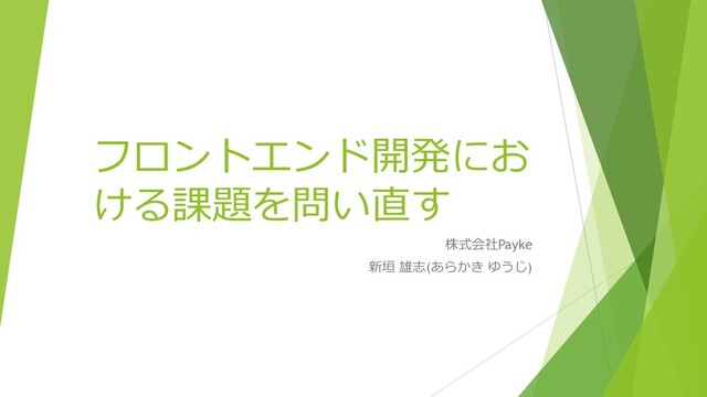 Paykeに所属 u ソフトウェアエンジニア u フロントエンドエンジニアではないが、フロントエンドもやる u 過去実績 u Angular.jsで公共施設予約サイト管理画⾯ u Angular.jsで某エンジニア向けイベント情報サイト管理画⾯ u React.jsで求⼈サイトの管理画⾯開発 u Vue.jsでWebサイトの⼀部を動的に実装 u Ionic(angular/typescript)でモバイルアプリ開発