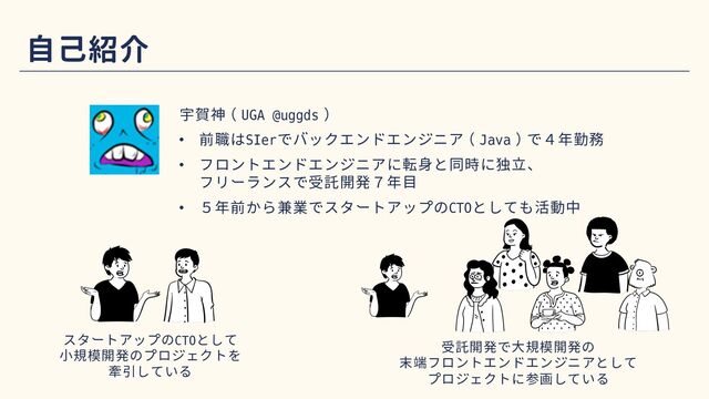 自己紹介 宇賀神(UGA @uggds) • 前職はSIerでバックエンドエンジニア(Java)で4年勤務 • フロントエンドエンジニアに転身と同時に独立、 フリーランスで受託開発7年目 • 5年前から兼業でスタートアップのCTOとしても活動中