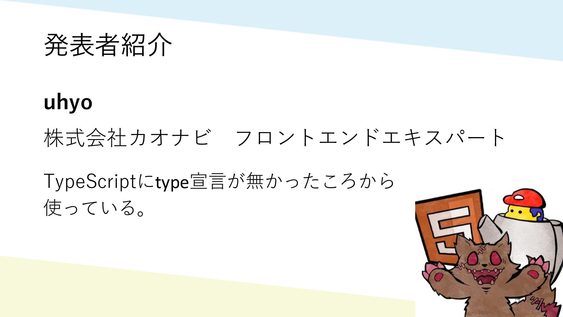 発表者紹介 uhyo 株式会社カオナビ フロントエンドエキスパート TypeScriptにtype宣言が無かったころから 使っている。 2