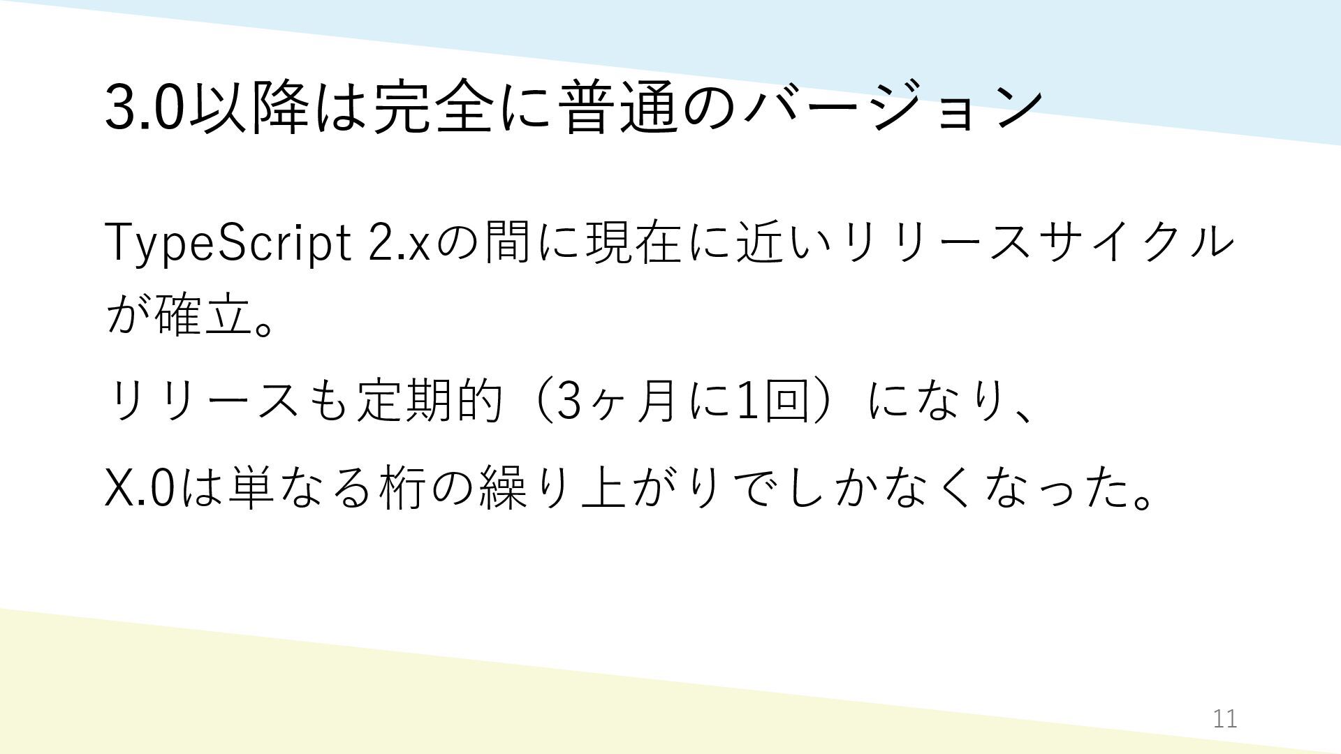 3.0以降は完全に普通のバージョン TypeScript 2.xの間に現在に近いリリースサイクル が確立。 リリースも定期的(3ヶ月に1回)になり、 X.0は単なる桁の繰り上がりでしかなくなった。 11