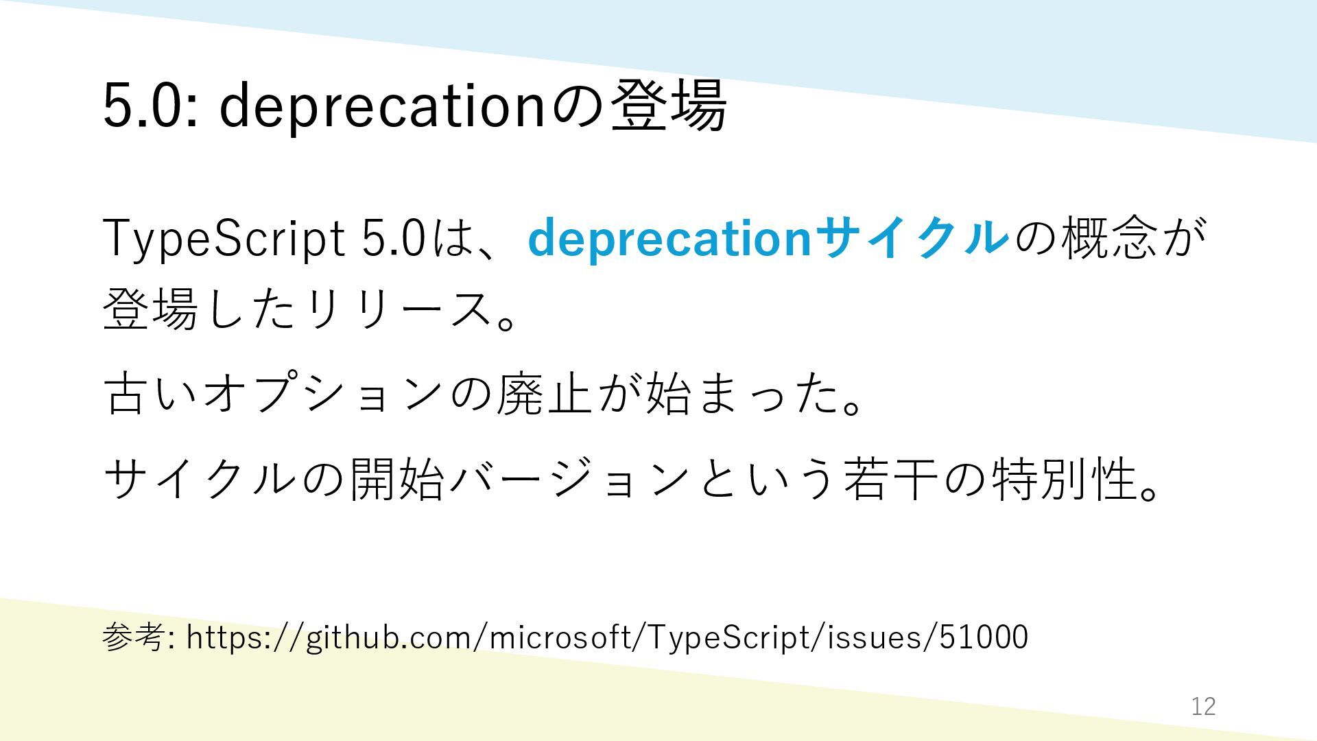 5.0: deprecationの登場 TypeScript 5.0は、deprecationサイクルの概念が 登場したリリース。 古いオプションの廃止が始まった。 サイクルの開始バージョンという若干の特別性。 参考: https://github.com/microsoft/TypeScript/issues/51000 12
