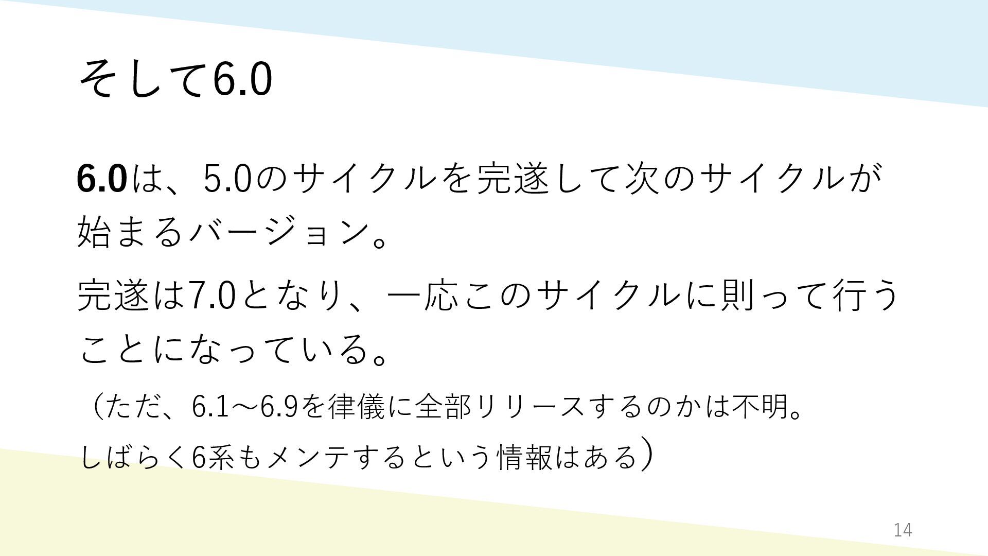 そして6.0 6.0は、5.0のサイクルを完遂して次のサイクルが 始まるバージョン。 完遂は7.0となり、一応このサイクルに則って行う ことになっている。 (ただ、6.1~6.9を律儀に全部リリースするのかは不明。 しばらく6系もメンテするという情報はある) 14