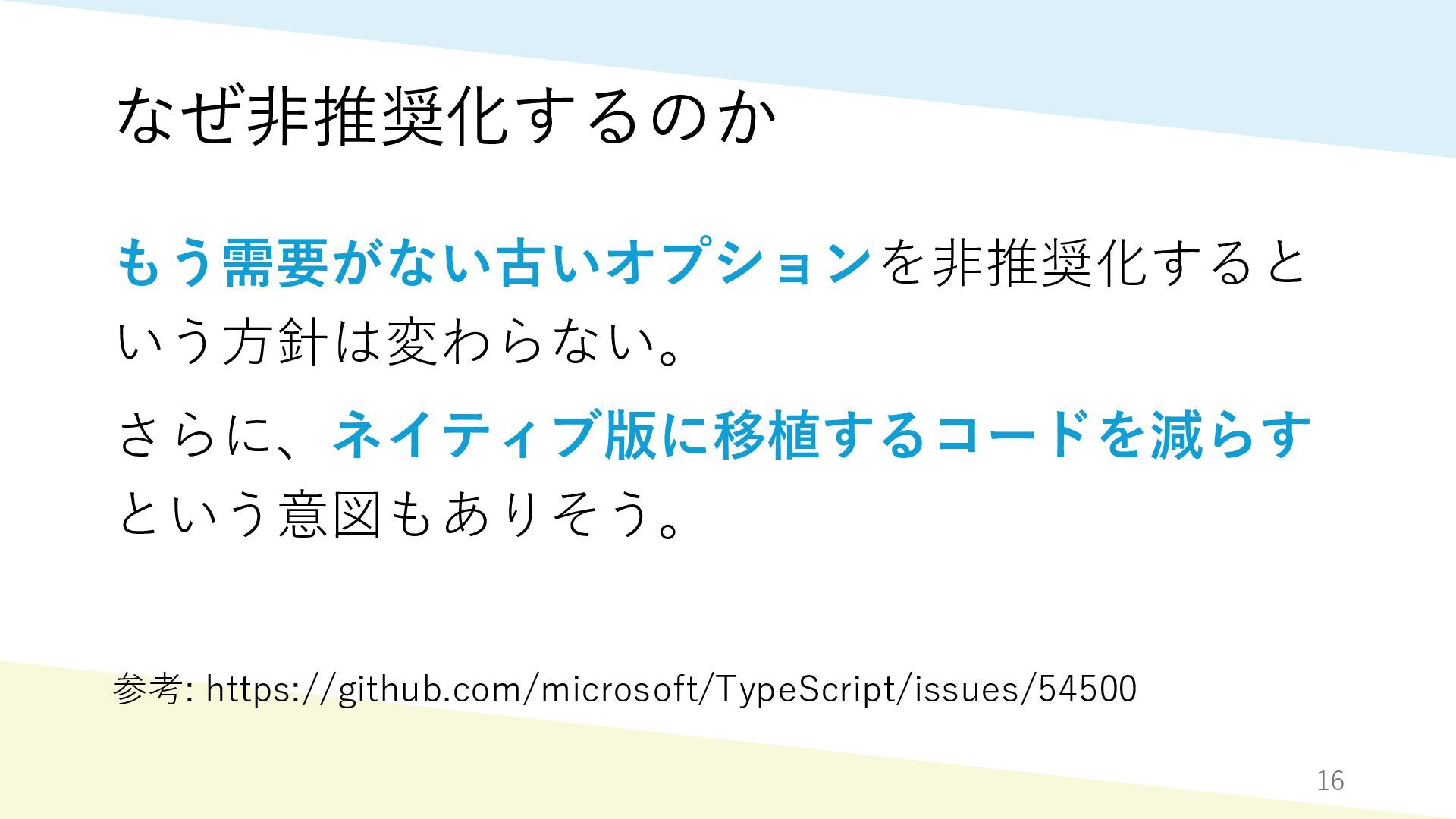 なぜ非推奨化するのか もう需要がない古いオプションを非推奨化すると いう方針は変わらない。 さらに、ネイティブ版に移植するコードを減らす という意図もありそう。 参考: https://github.com/microsoft/TypeScript/issues/54500 16