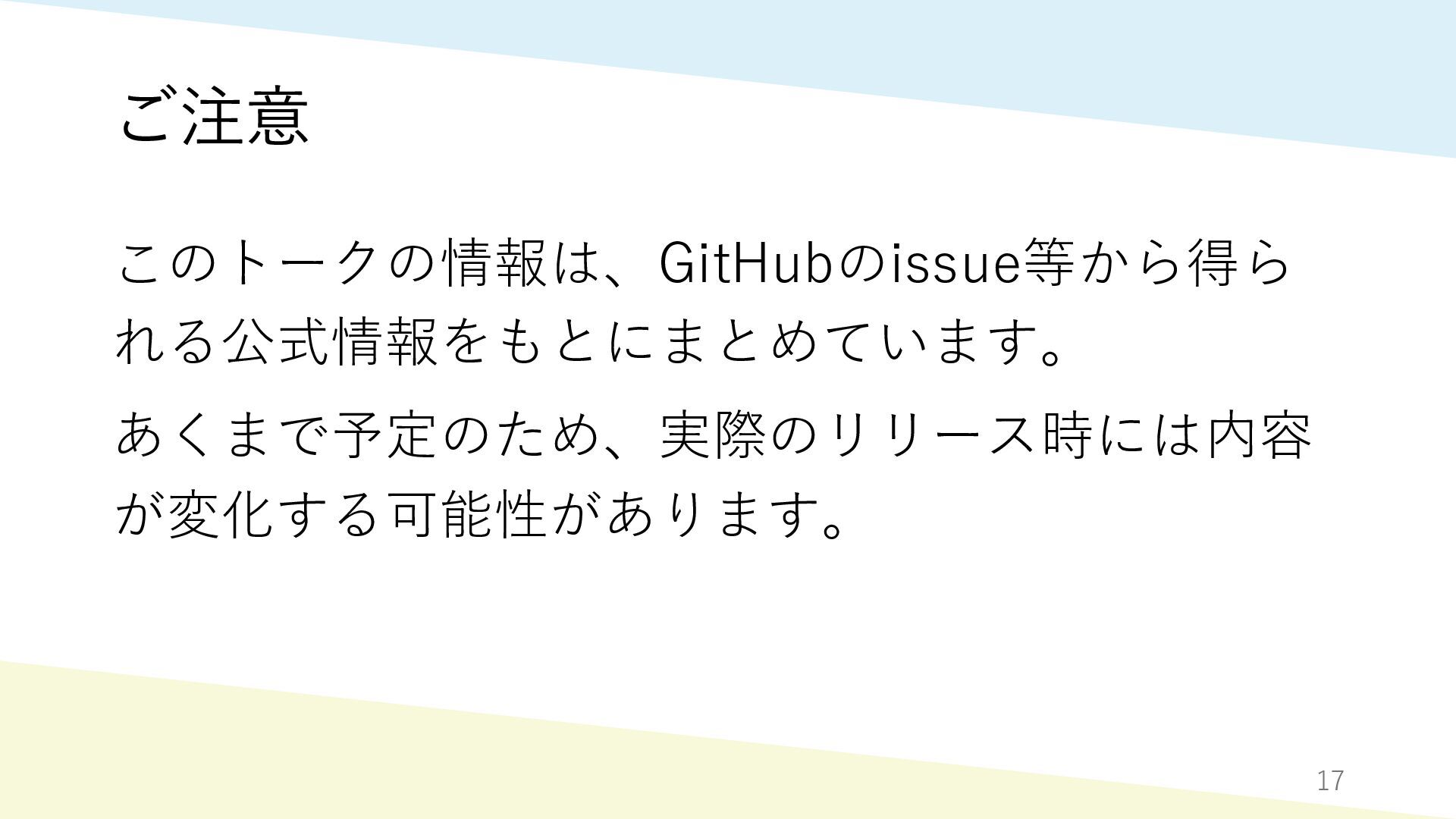 ご注意 このトークの情報は、GitHubのissue等から得ら れる公式情報をもとにまとめています。 あくまで予定のため、実際のリリース時には内容 が変化する可能性があります。 17