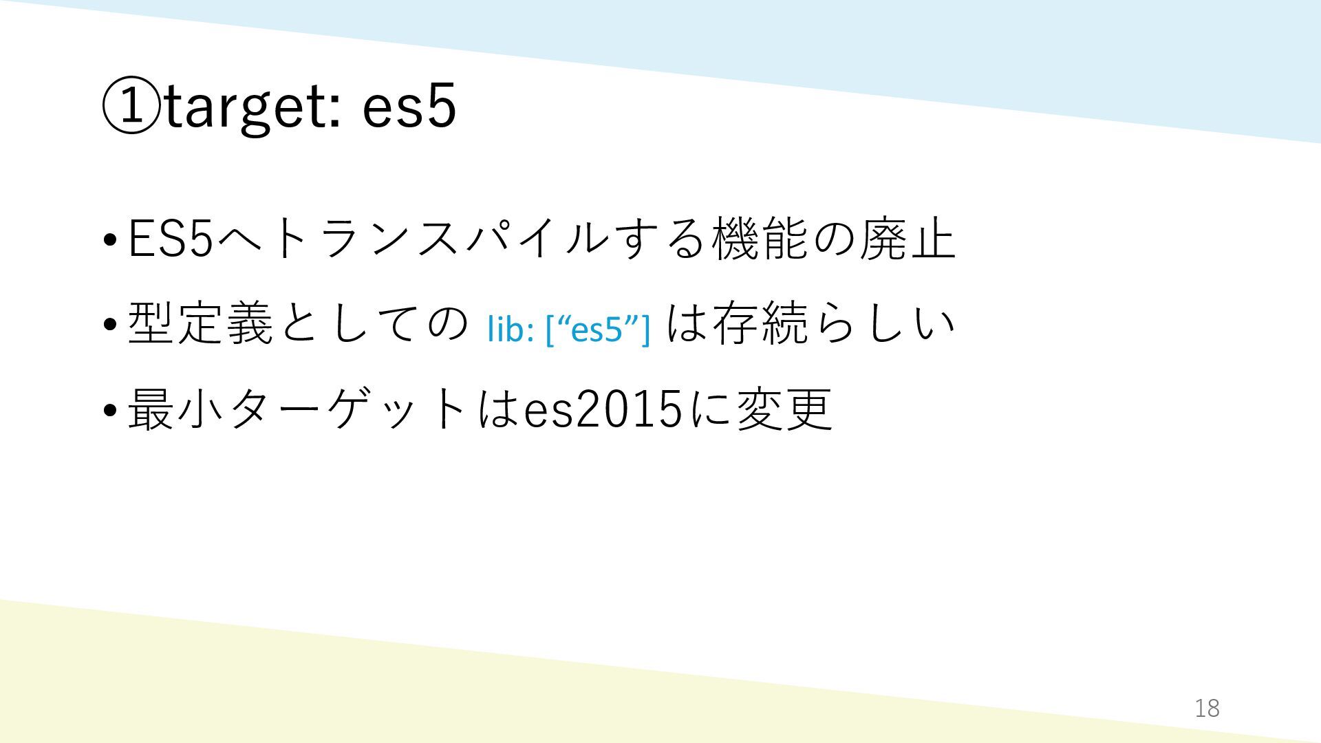 ①target: es5 •ES5へトランスパイルする機能の廃止 •型定義としての lib: [“es5”] は存続らしい •最小ターゲットはes2015に変更 18