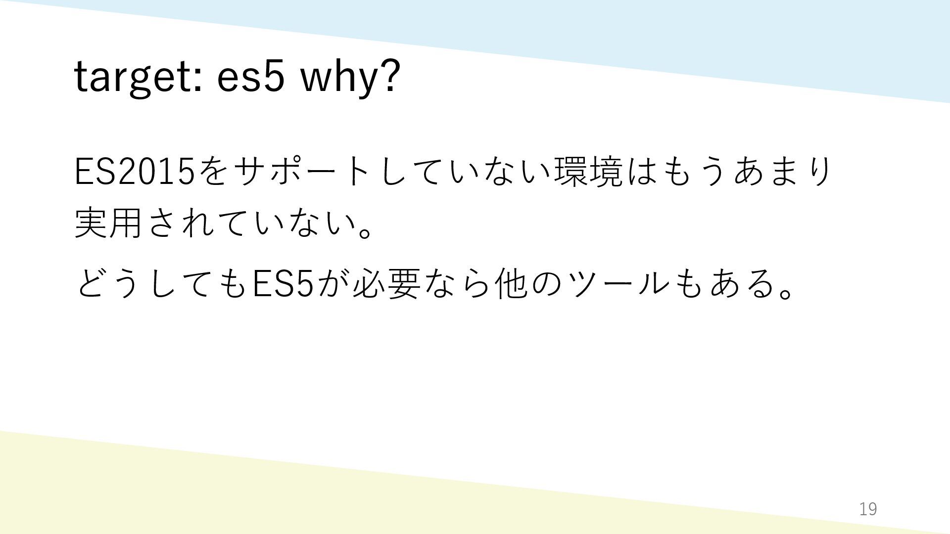 target: es5 why? ES2015をサポートしていない環境はもうあまり 実用されていない。 どうしてもES5が必要なら他のツールもある。 19