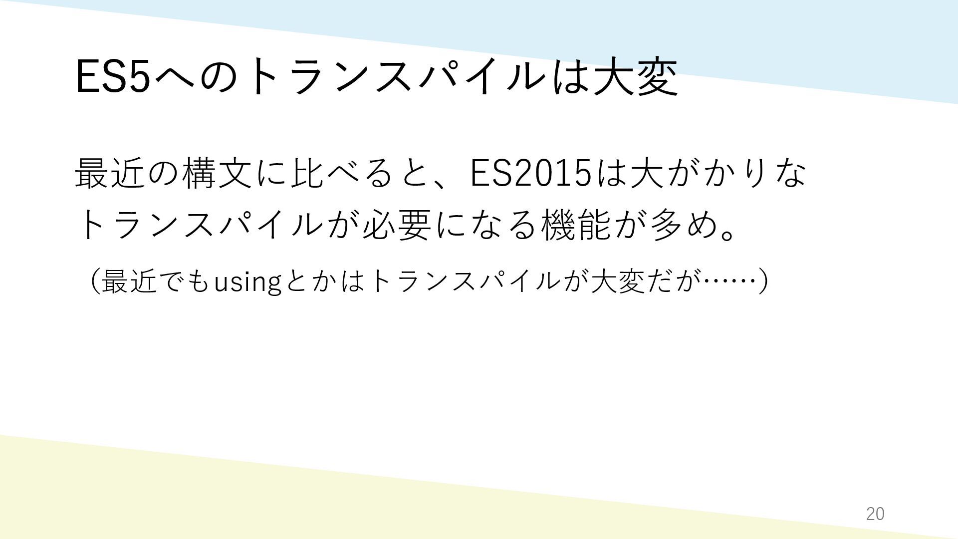 ES5へのトランスパイルは大変 最近の構文に比べると、ES2015は大がかりな トランスパイルが必要になる機能が多め。 (最近でもusingとかはトランスパイルが大変だが……) 20