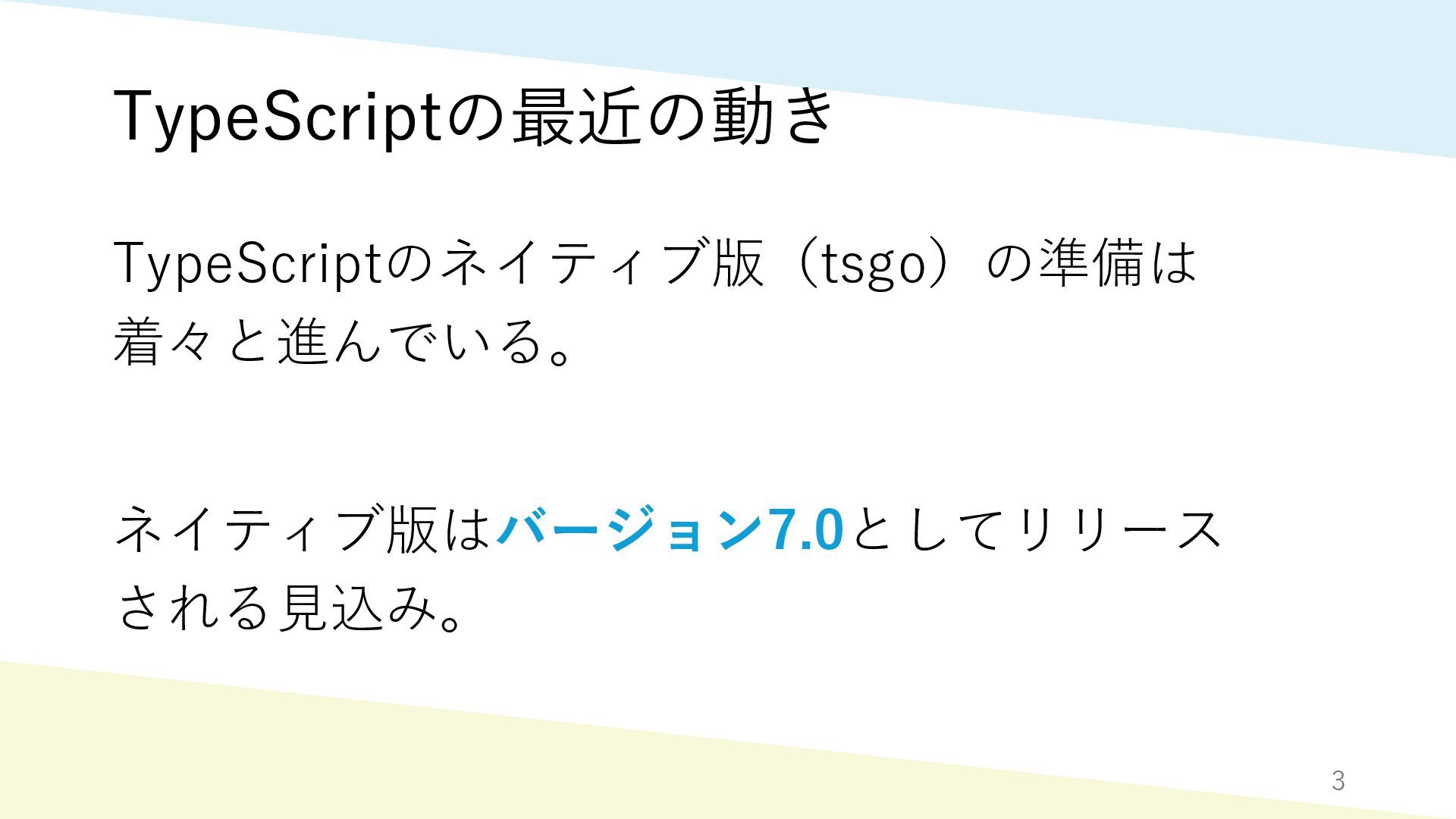 TypeScriptの最近の動き TypeScriptのネイティブ版(tsgo)の準備は 着々と進んでいる。 ネイティブ版はバージョン7.0としてリリース される見込み。 3
