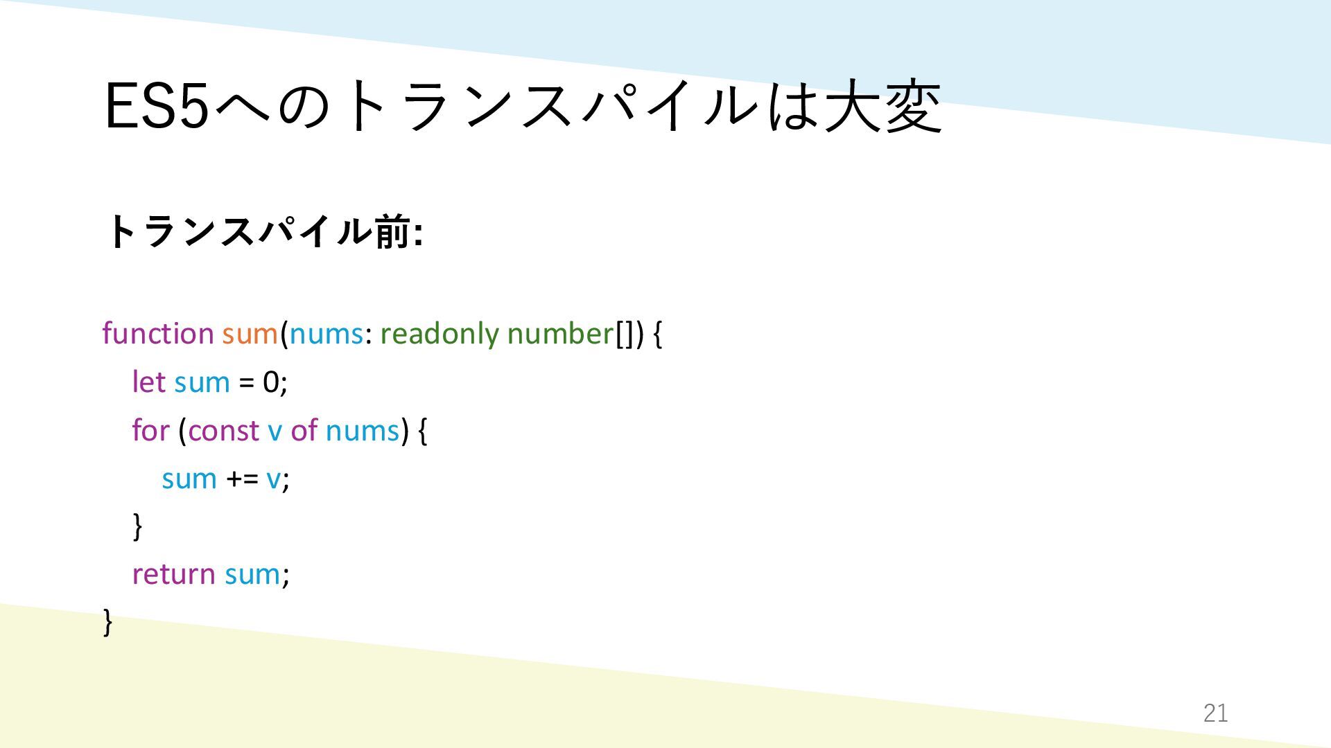 ES5へのトランスパイルは大変 トランスパイル前: function sum(nums: readonly number[]) { let sum =