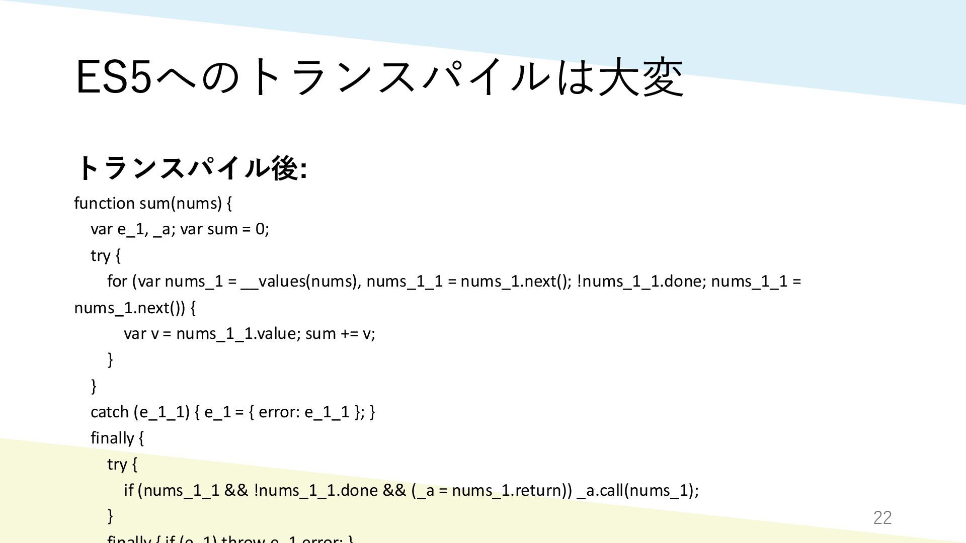 ES5へのトランスパイルは大変 トランスパイル後: function sum(nums) { var e_1, _a; var sum
