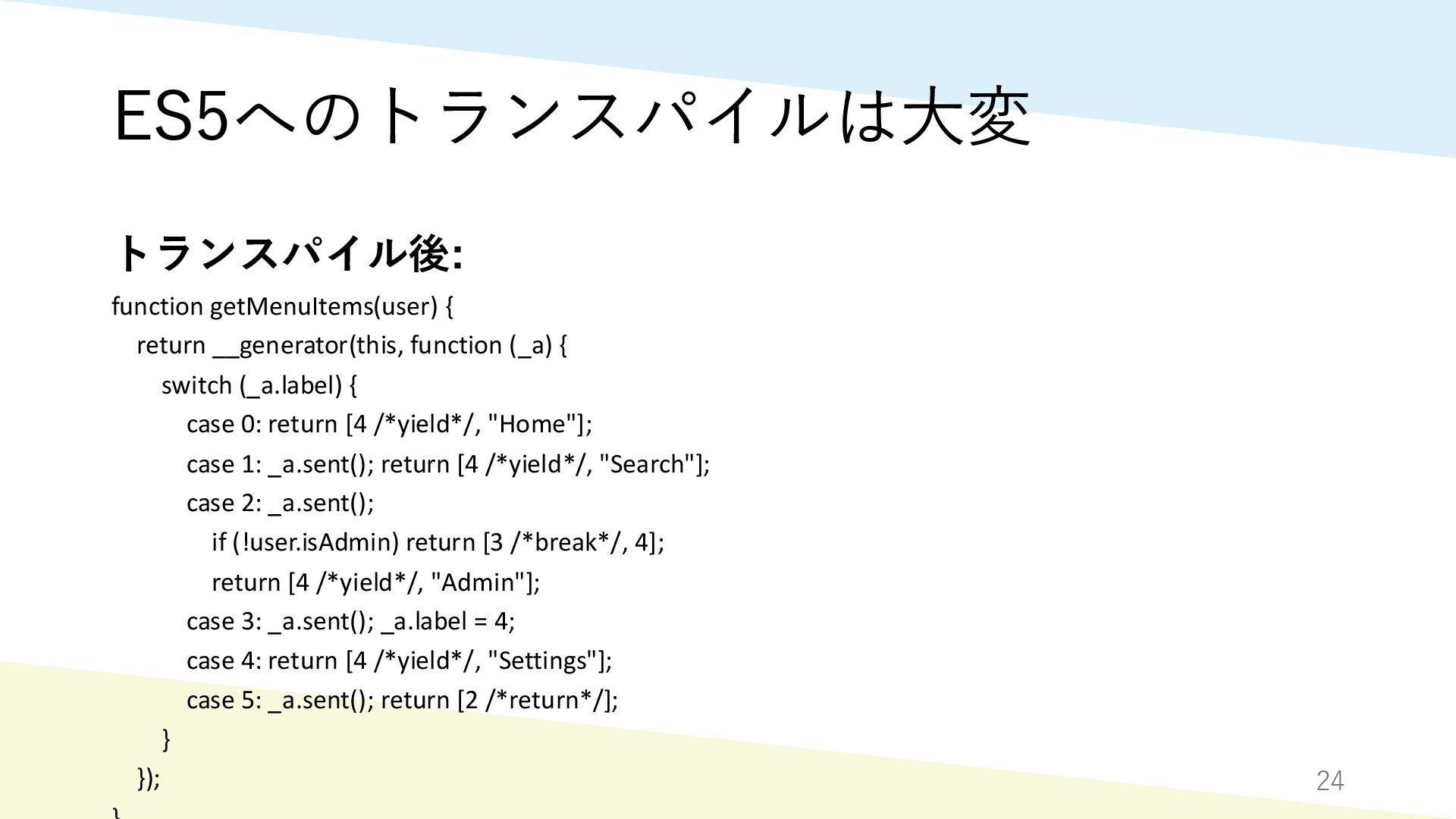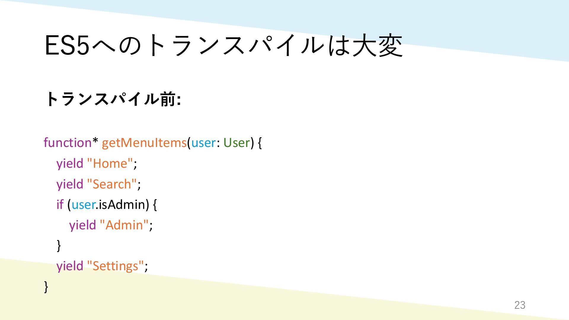 ES5へのトランスパイルは大変 トランスパイル前: function* getMenuItems(user: User) { yield "Home"; yield "Search";