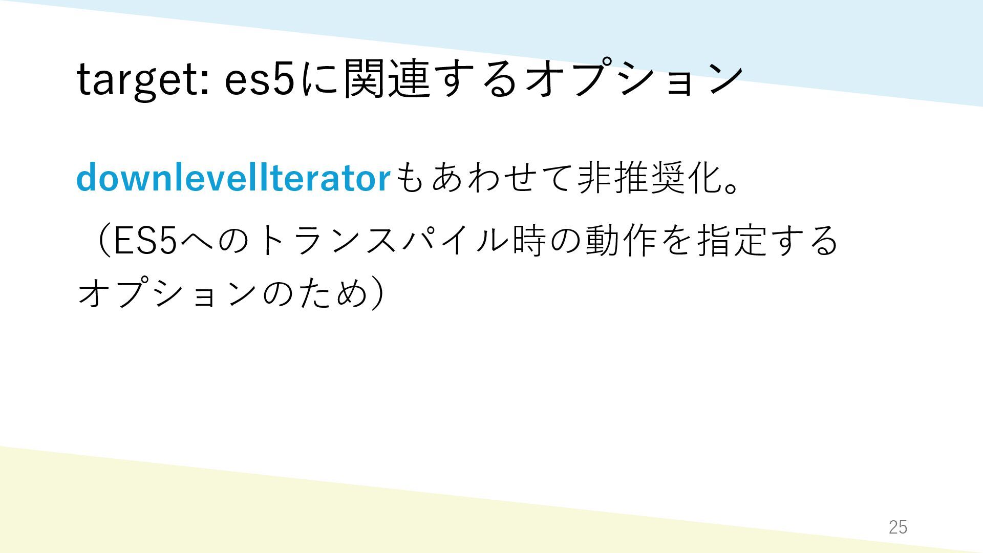 target: es5に関連するオプション downlevelIteratorもあわせて非推奨化。 (ES5へのトランスパイル時の動作を指定する オプションのため) 25