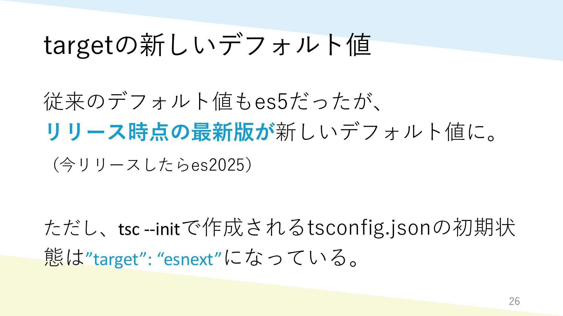 targetの新しいデフォルト値 従来のデフォルト値もes5だったが、 リリース時点の最新版が新しいデフォルト値に。 (今リリースしたらes2025) ただし、tsc --initで作成されるtsconfig.jsonの初期状 態は”target”: “esnext”になっている。 26
