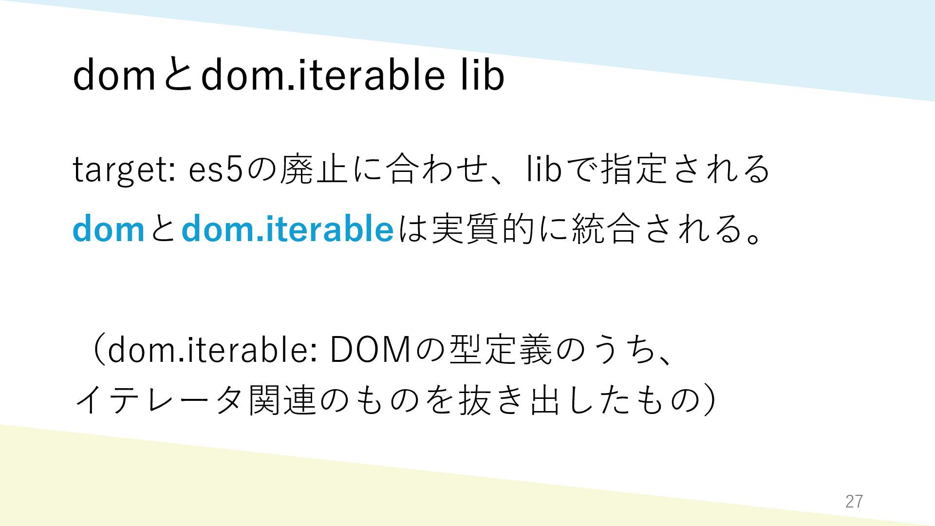 domとdom.iterable lib target: es5の廃止に合わせ、libで指定される domとdom.iterableは実質的に統合される。 (dom.iterable: DOMの型定義のうち、 イテレータ関連のものを抜き出したもの) 27