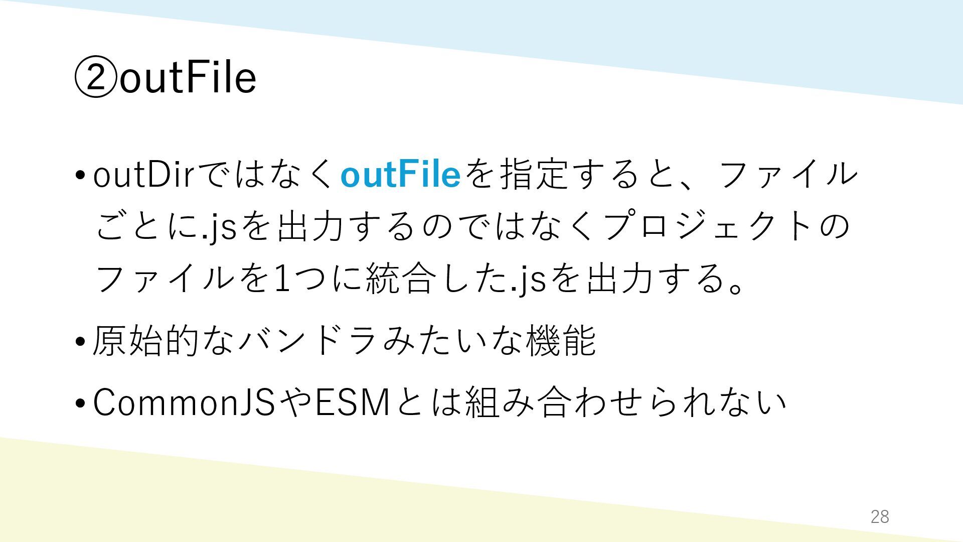 ②outFile •outDirではなくoutFileを指定すると、ファイル ごとに.jsを出力するのではなくプロジェクトの ファイルを1つに統合した.jsを出力する。 •原始的なバンドラみたいな機能 •CommonJSやESMとは組み合わせられない 28