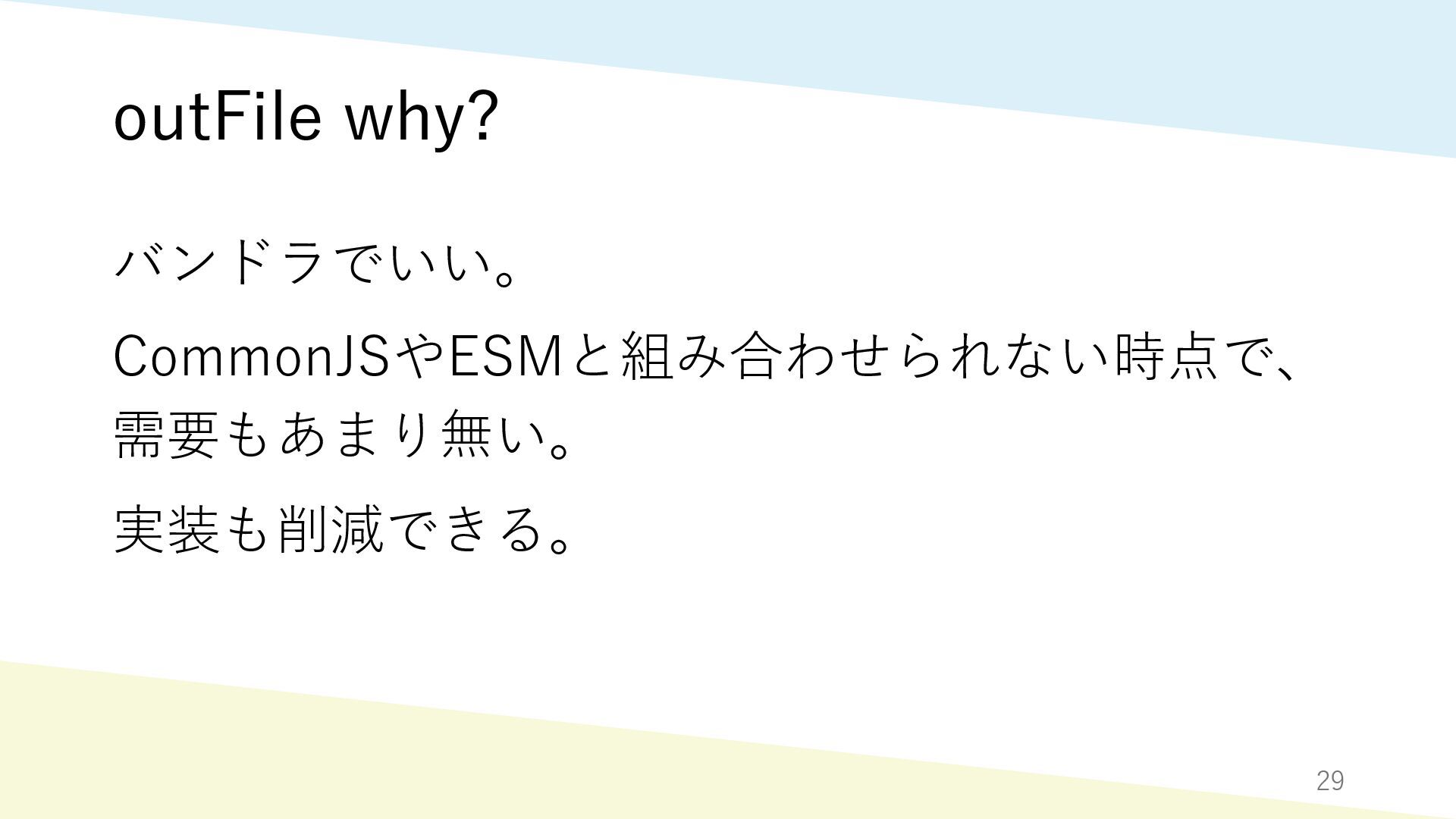 outFile why? バンドラでいい。 CommonJSやESMと組み合わせられない時点で、 需要もあまり無い。 実装も削減できる。 29