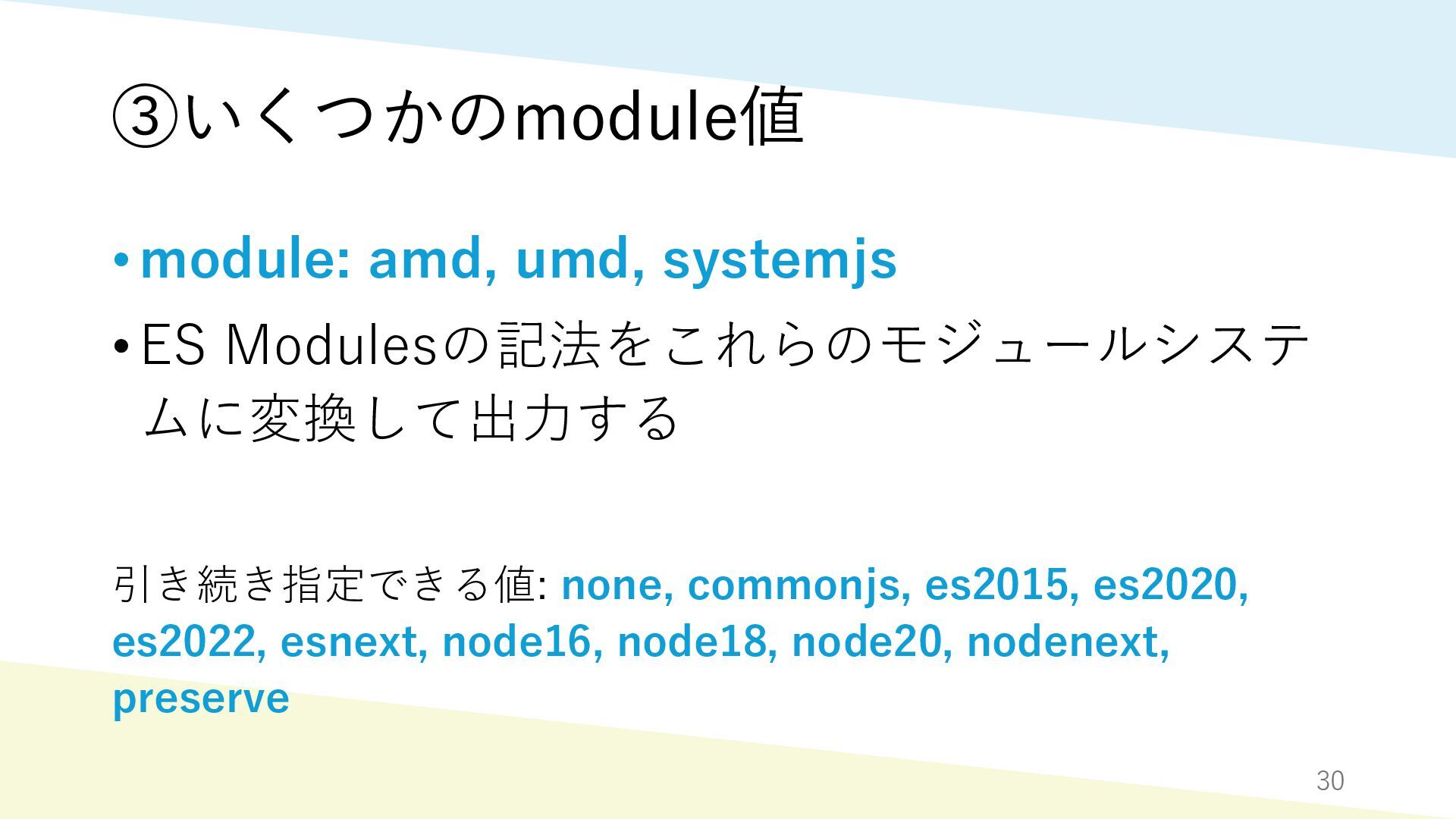 ③いくつかのmodule値 •module: amd, umd, systemjs •ES Modulesの記法をこれらのモジュールシステ ムに変換して出力する 引き続き指定できる値: none,