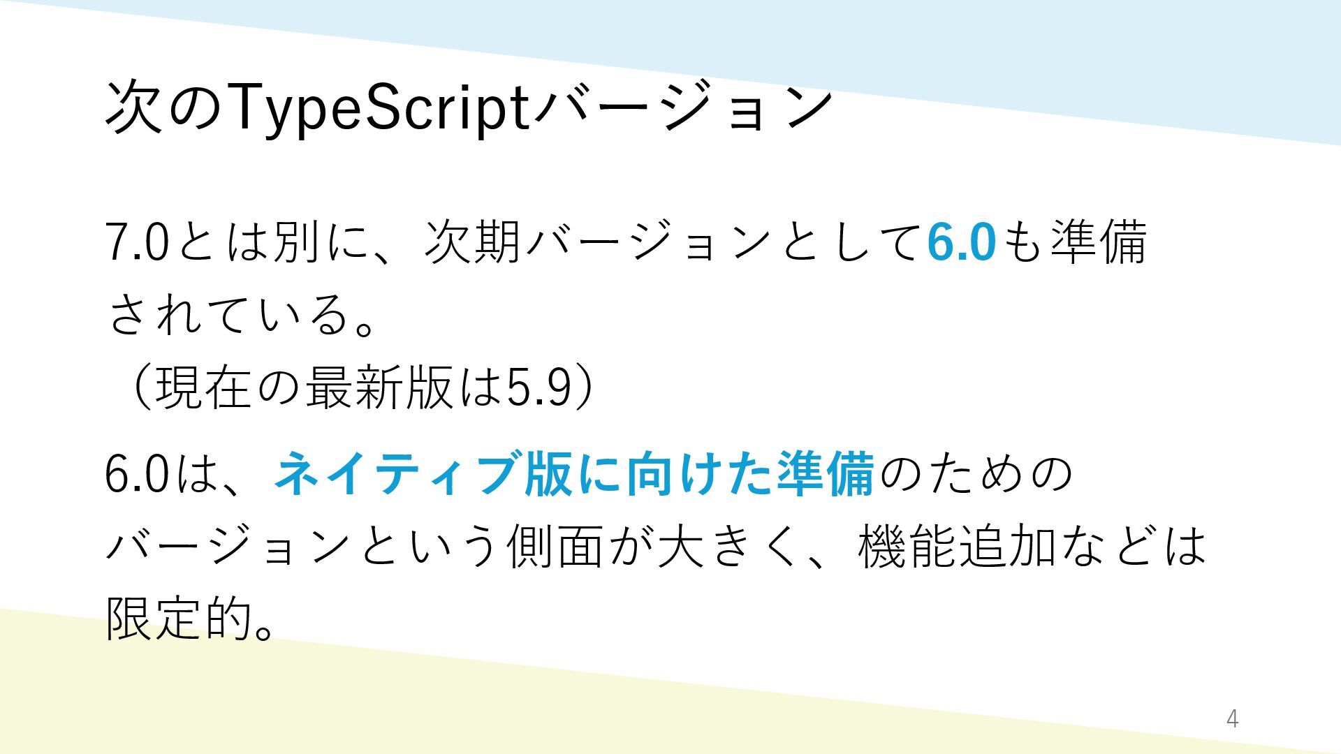 次のTypeScriptバージョン 7.0とは別に、次期バージョンとして6.0も準備 されている。 (現在の最新版は5.9) 6.0は、ネイティブ版に向けた準備のための バージョンという側面が大きく、機能追加などは 限定的。 4