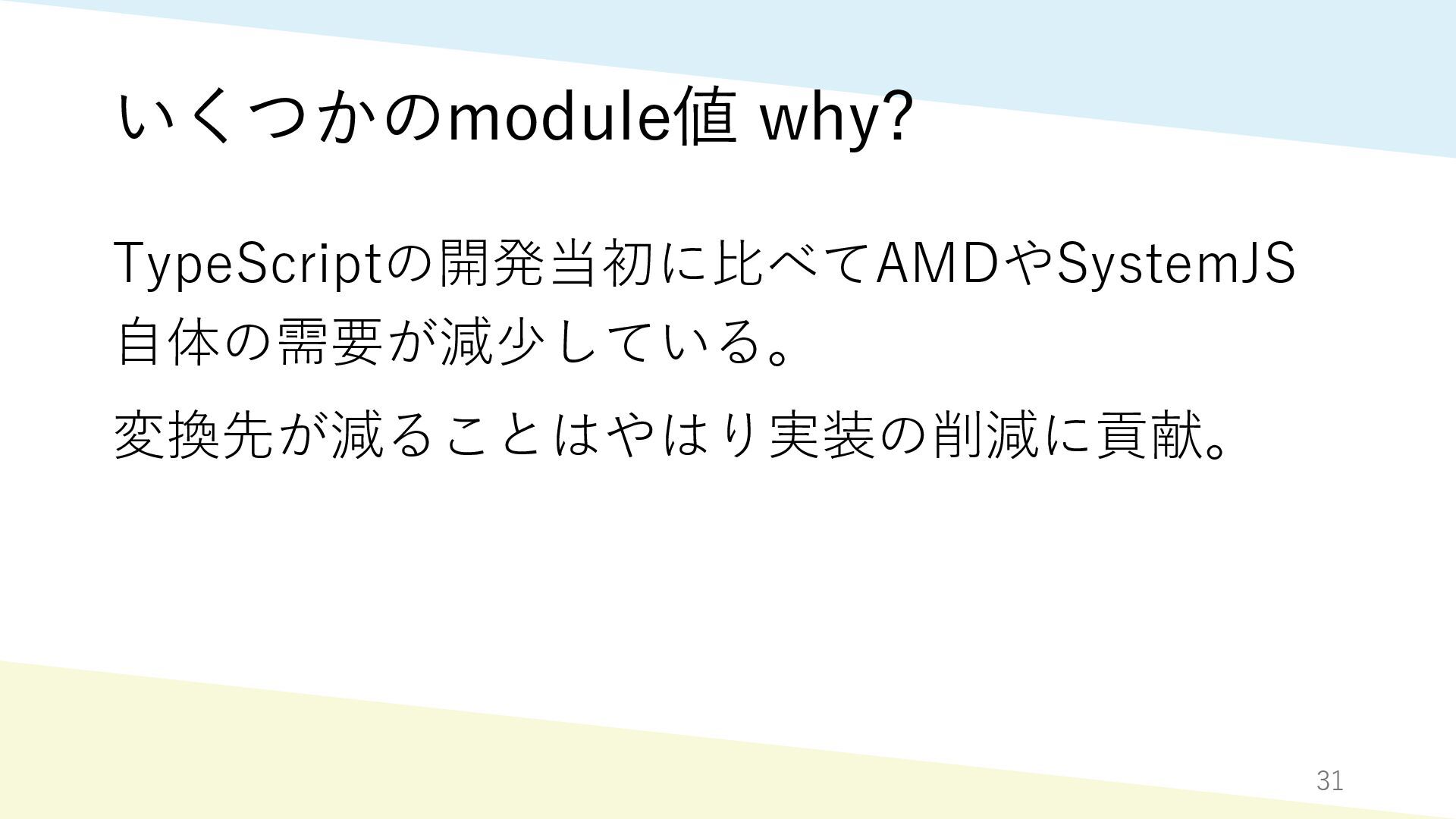 いくつかのmodule値 why? TypeScriptの開発当初に比べてAMDやSystemJS 自体の需要が減少している。 変換先が減ることはやはり実装の削減に貢献。 31