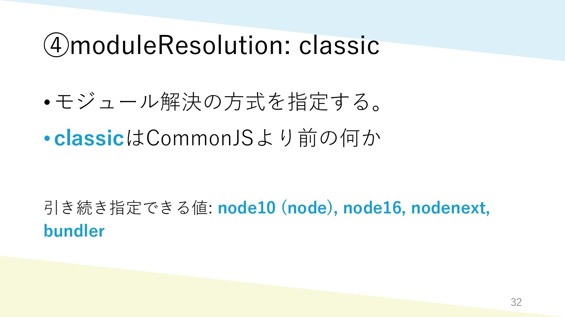 ④moduleResolution: classic •モジュール解決の方式を指定する。 •classicはCommonJSより前の何か 引き続き指定できる値: node10 (node), node16, nodenext, bundler