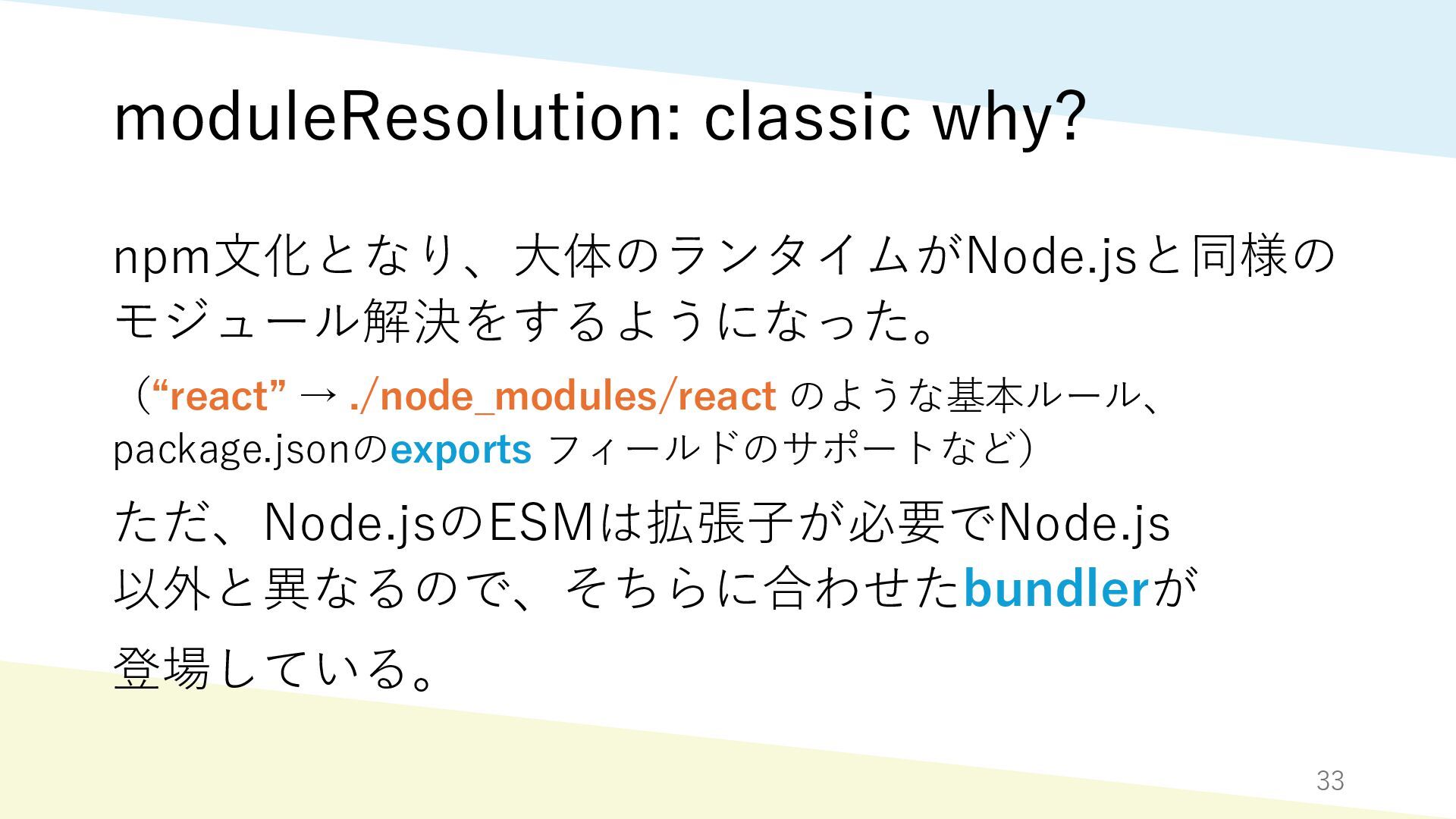 moduleResolution: classic why? npm文化となり、大体のランタイムがNode.jsと同様の モジュール解決をするようになった。 (“react” → ./node_modules/react のような基本ルール、 package.jsonのexports