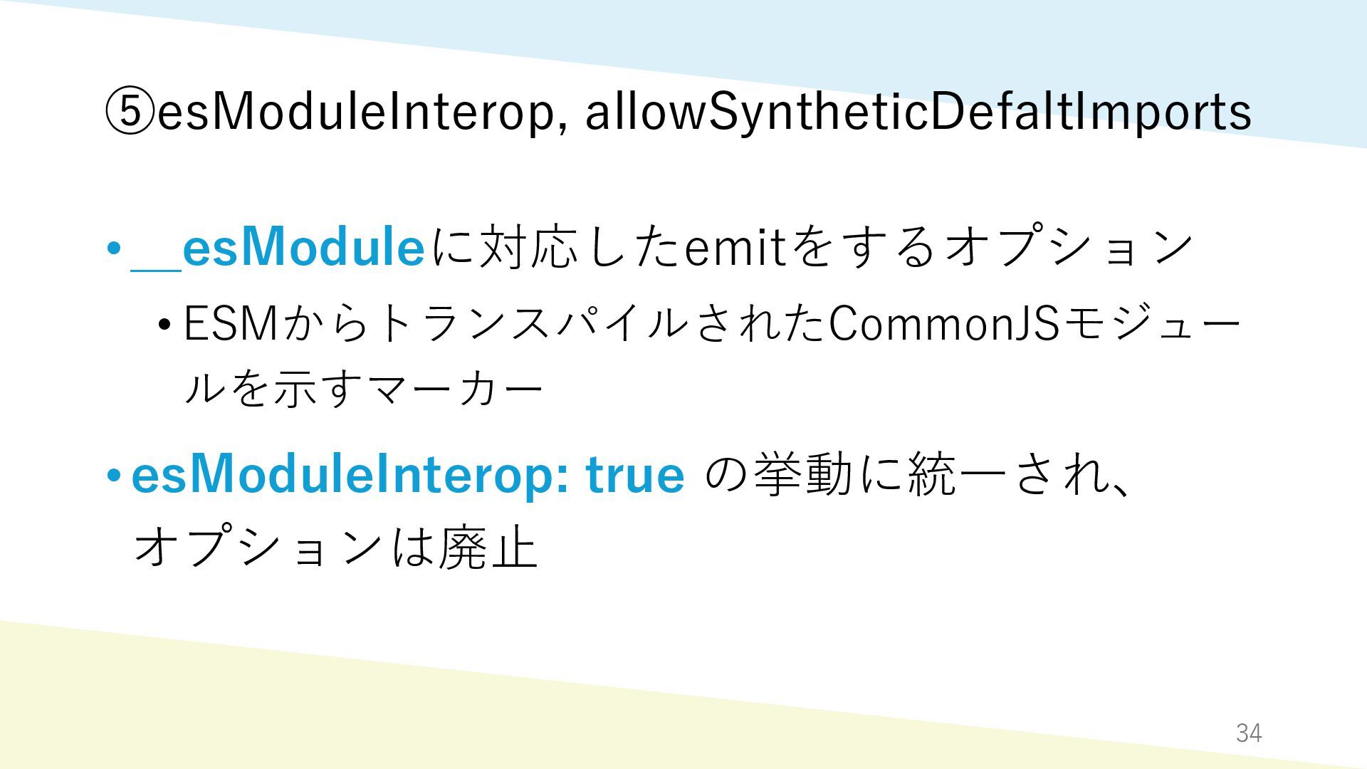 ⑤esModuleInterop, allowSyntheticDefaltImports •__esModuleに対応したemitをするオプション • ESMからトランスパイルされたCommonJSモジュー ルを示すマーカー •esModuleInterop: true の挙動に統一され、 オプションは廃止