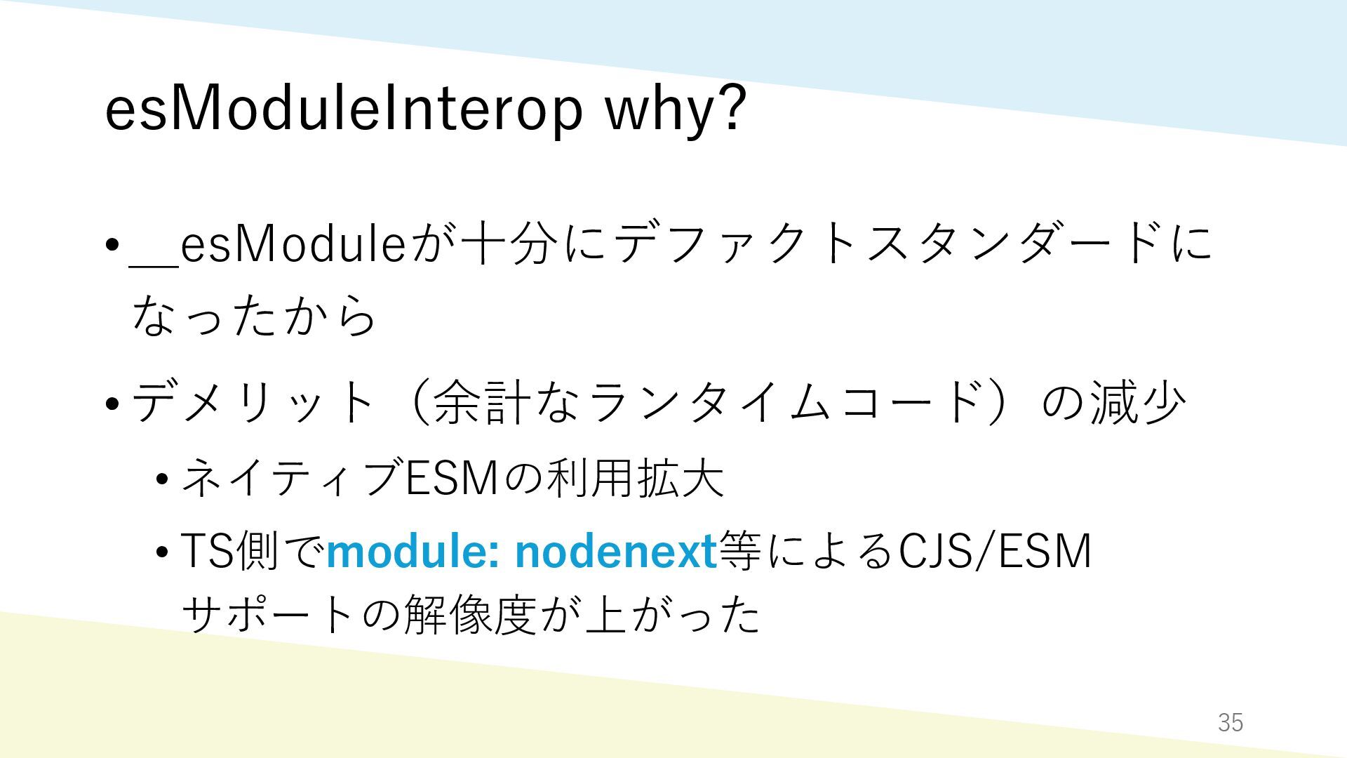 esModuleInterop why? •__esModuleが十分にデファクトスタンダードに なったから •デメリット(余計なランタイムコード)の減少 • ネイティブESMの利用拡大 • TS側でmodule: nodenext等によるCJS/ESM