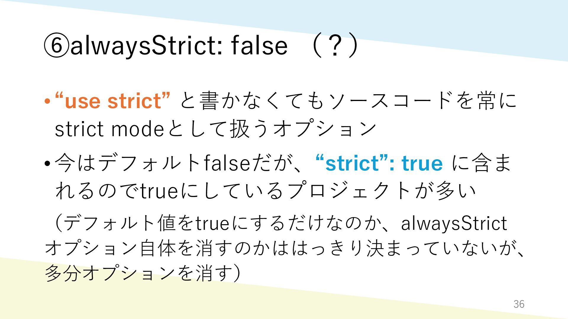 ⑥alwaysStrict: false (?) •“use strict” と書かなくてもソースコードを常に strict modeとして扱うオプション •今はデフォルトfalseだが、“strict”: true