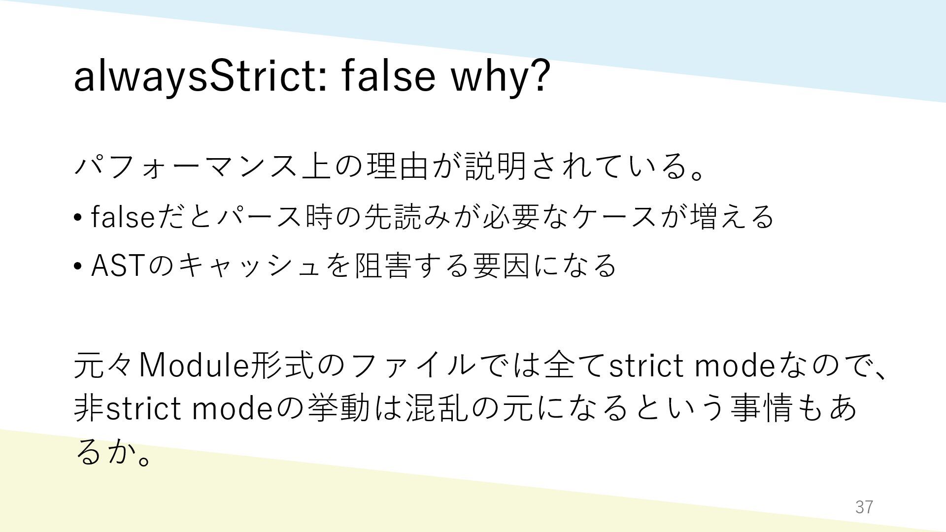 alwaysStrict: false why? パフォーマンス上の理由が説明されている。 • falseだとパース時の先読みが必要なケースが増える • ASTのキャッシュを阻害する要因になる 元々Module形式のファイルでは全てstrict modeなので、