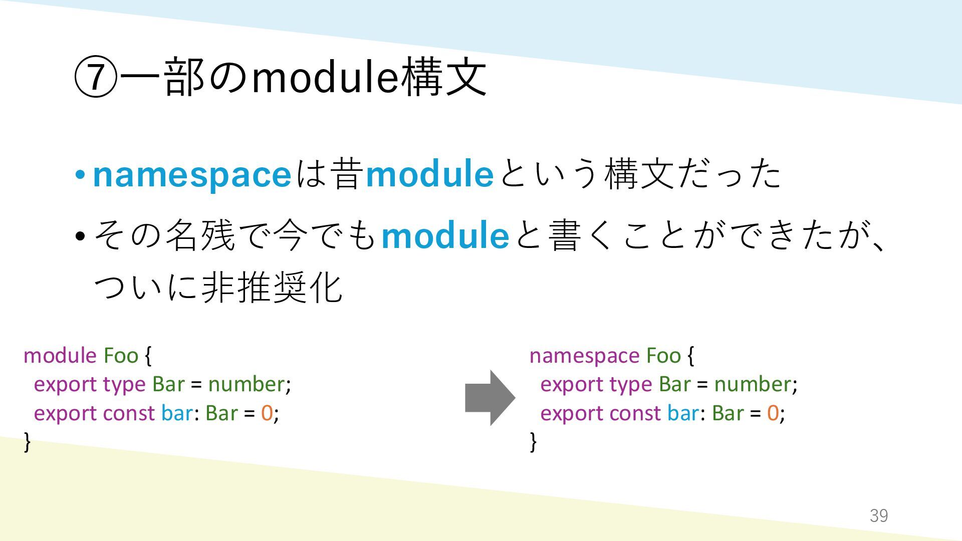 ⑦一部のmodule構文 •namespaceは昔moduleという構文だった •その名残で今でもmoduleと書くことができたが、 ついに非推奨化 39 module Foo { export type