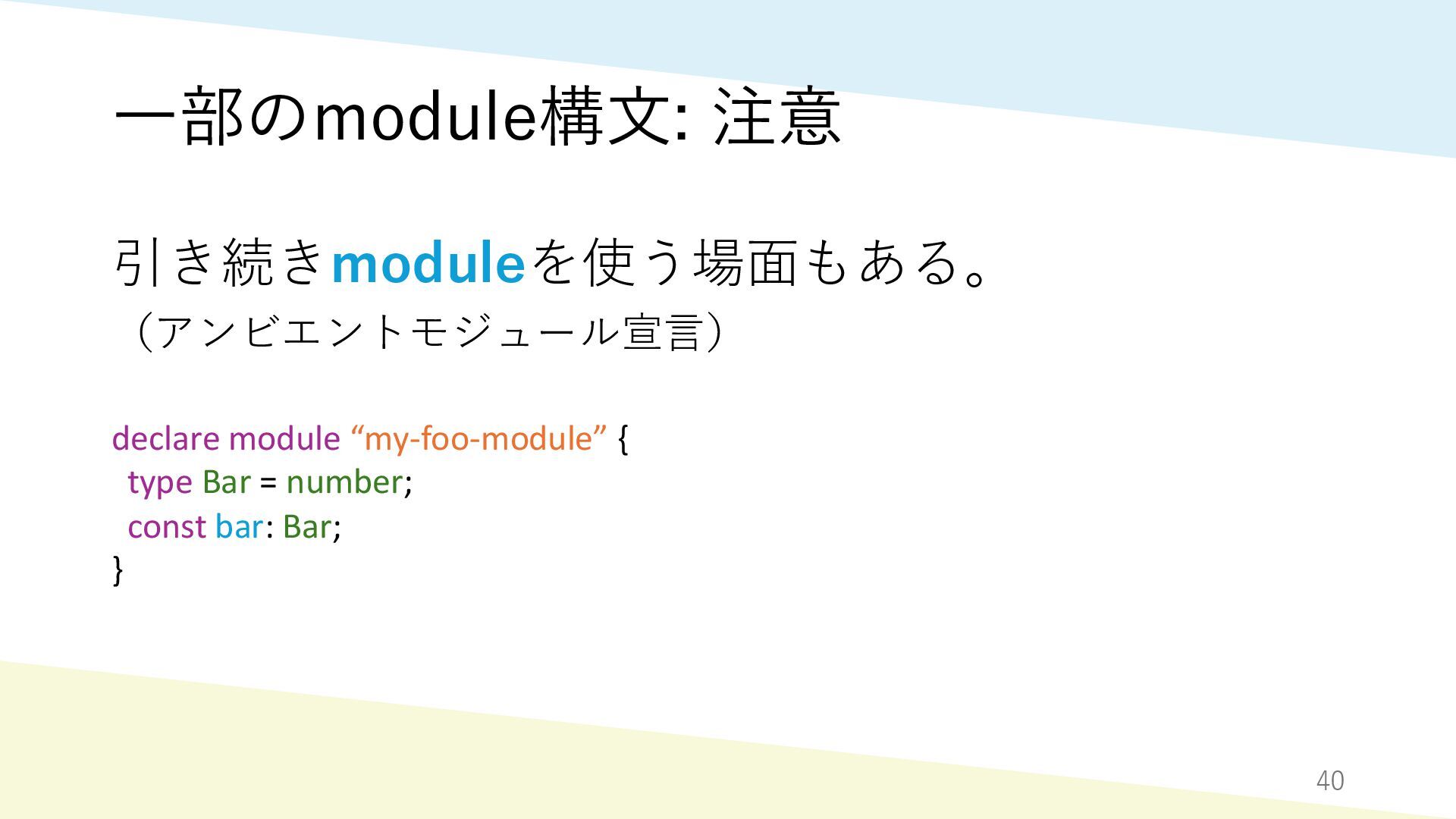 一部のmodule構文: 注意 引き続きmoduleを使う場面もある。 (アンビエントモジュール宣言) 40 declare module “my-foo-module” { type